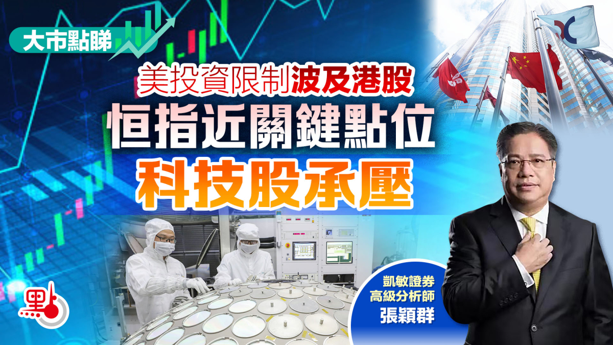 科技股今日集體走弱。對此,凱敏證券高級分析師張穎群稱,美國財政部昨日公布,限制當地企業投資三類中國高科技的公司,當中包括量子計算技術、人工智能及半導體芯片等。美國企業投資在有關連項目的上市公司同遭限制,而相關的限制範圍同時包括香港及澳門。上述消息拖累港交所內的科技股和相關股份全面向下。