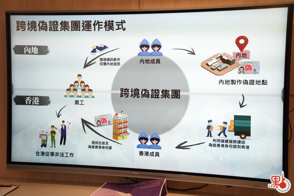 今年5月,內地執法機關發現一個跨境偽證集團,在內地通過手機通訊程式,開啟不同群組招攬內地居民來香港「打黑工」。犯罪集團宣稱會提供所謂「一條龍」服務,提供假身份證,安排入住「黑工」宿舍,並聲稱「保證有工開」等。犯罪集團根據內地居民的個人資料和相片製造假香港身份證,並經過速遞公司送到香港骨幹成員手中,意圖避開口岸邊境人員的檢查。身份證最後會交給來到香港「打黑工」的內地居民手中,犯罪集團也會安排他們入住全香港不同地區的「黑工」宿舍。