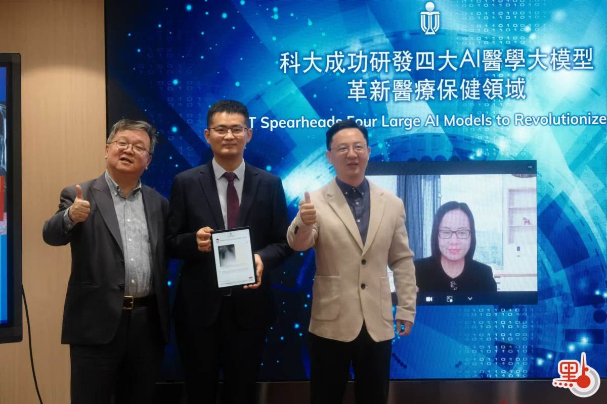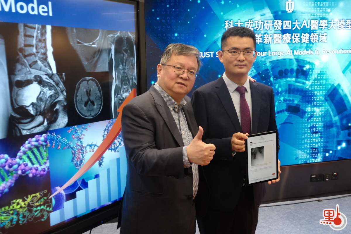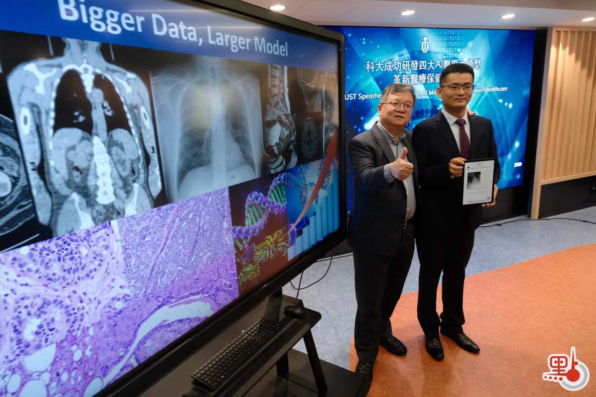 科大首席副校長郭毅可與負責領導研究的科大計算機科學及工程學系助理教授陳浩今日(31日)就4個AI醫學模型的研究成果與應用潛力進行介紹。陳浩表示,這次歷時近3年的研究是透過科大的人工智能運算設施進行,在充足的運算力下,這些AI醫學系統得以由大量數據建構而成,結合團隊創新的機器學習訓練策略,性能表現比其他現有模型更為優秀,例如單是其中一個針對病理學而設的AI基礎模型,便曾處理逾1.6億張醫學圖像,涵蓋32癌症類別。