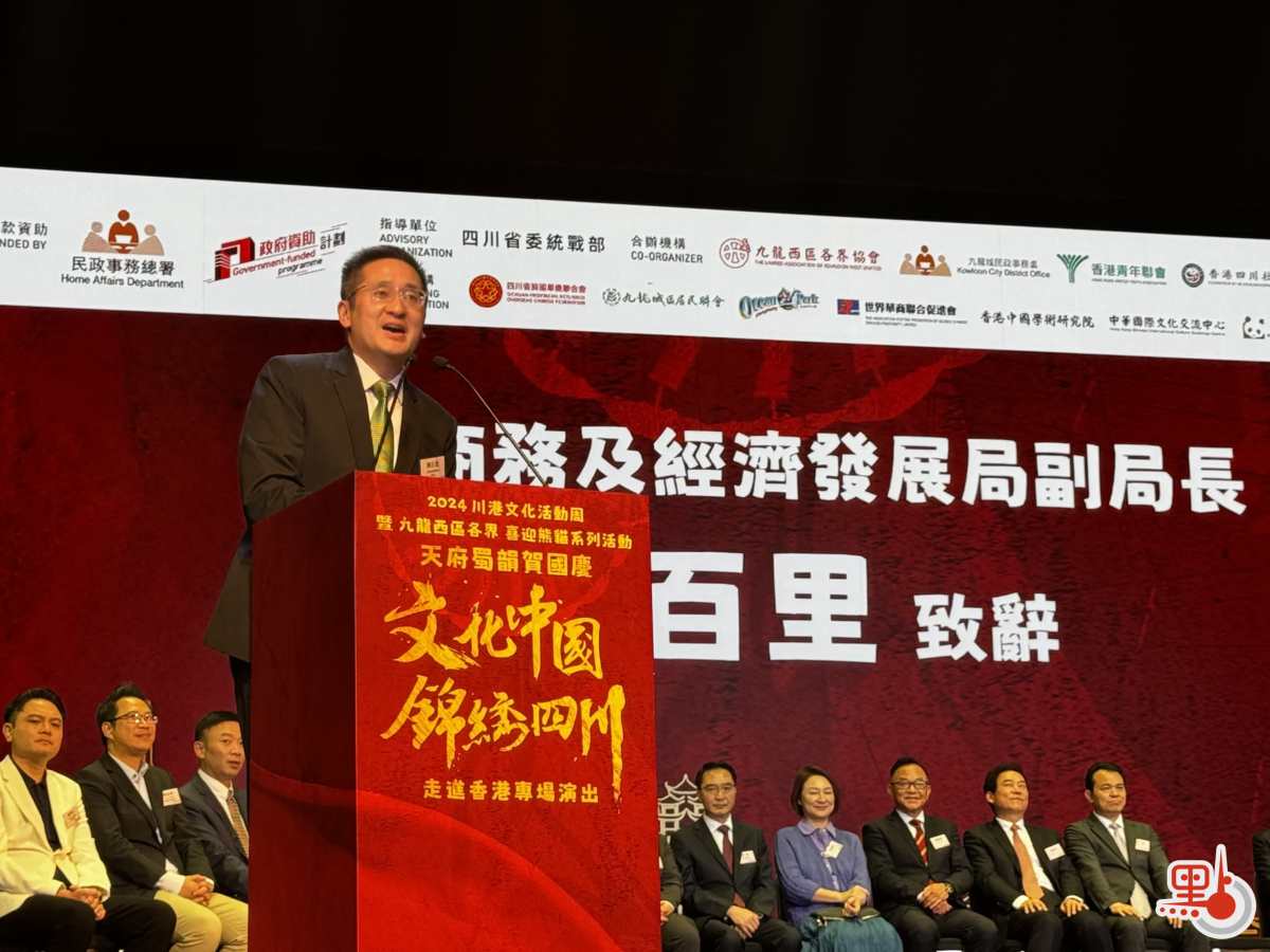 商務及經濟發展局副局長陳百里致辭時表示,他代表特區政府對四川省常委及各界領導的到來表示熱烈歡迎,並對九龍區各界年會及相關單位舉辦的系列文化活動給予高度評價。陳百里指出,四川代表團的精彩演出不僅讓香港市民領略了四川深厚的文化底蘊和多彩的民族風情,也有效提升了香港社會的歡樂氛圍。他強調,中央政府贈送的兩只大熊貓不僅是對香港的支持和關愛,更為工商界帶來了新的商機。零售和餐飲業紛紛推出熊貓主題產品和打卡位,吸引了大量市民和旅客的關注。他鼓勵中小企業和創業者繼續發揮創意,打造更多與熊貓相關的產品和服務,以延續熊貓熱潮,進一步推動香港經濟發展和消費增長。