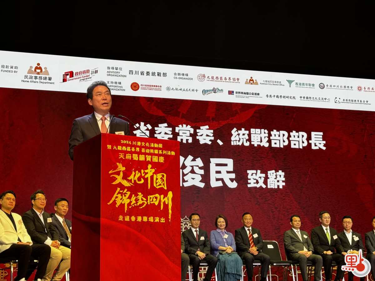 四川省委常委、統戰部部長趙俊民致辭時表示,四川不僅以其壯麗的自然風光和深厚的歷史文化著稱,還以其人民的熱情好客和豐富多彩的民俗活動聞名於世。他指出,通過這次活動,四川的文化精粹將走進香港的校園和社區,讓更多的香港市民近距離感受四川的魅力。他誠摯邀請香港市民到四川旅遊,親自體驗那裏的自然美景和人文風情,感受四川發展的活力和當地生活的悠閒。