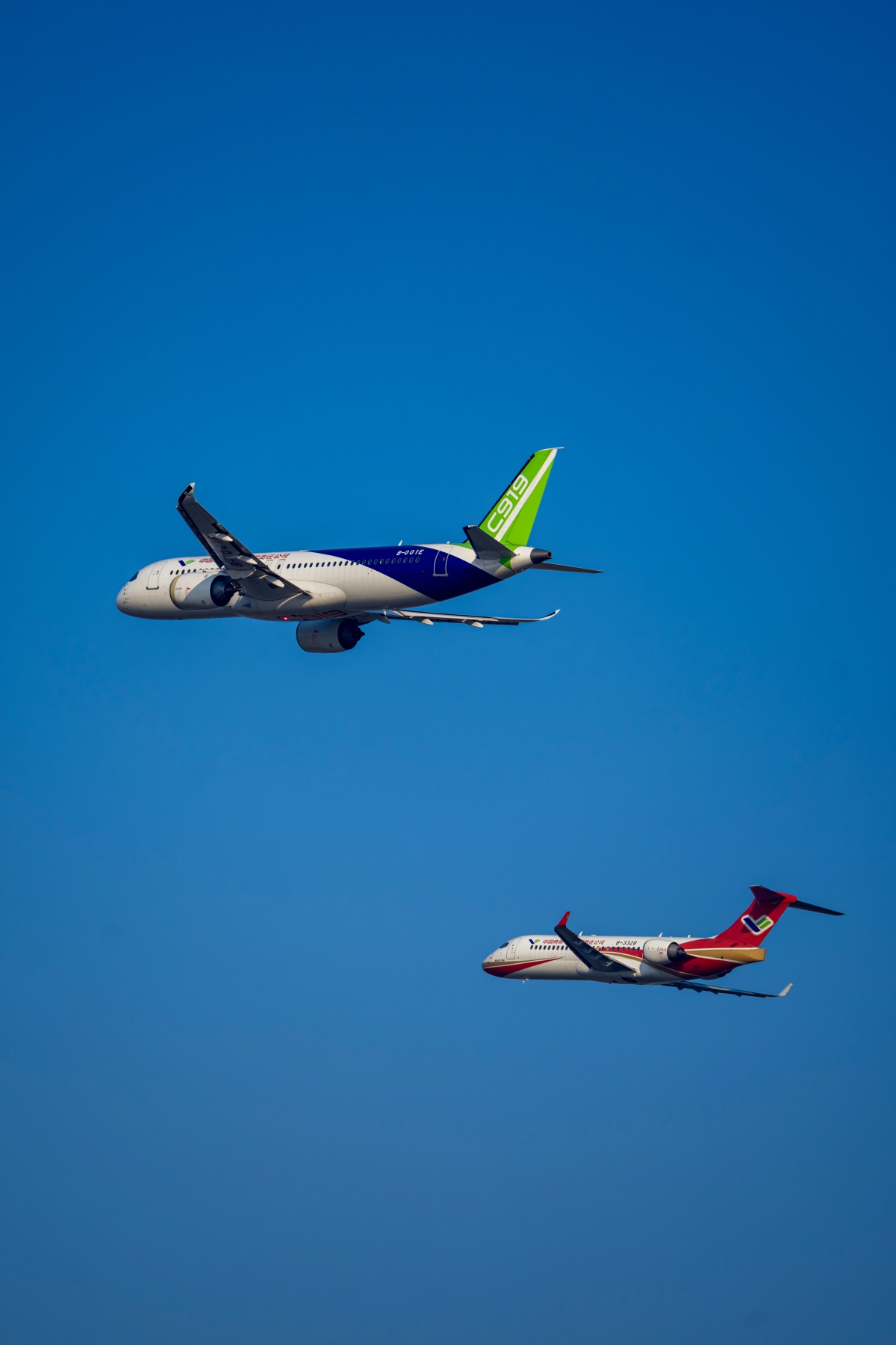 據中國商飛介紹,雙機編隊飛行表演後,ARJ21飛機先行着陸,C919飛機則繼續進行低空通場、大俯仰角爬升等單機飛行表演。