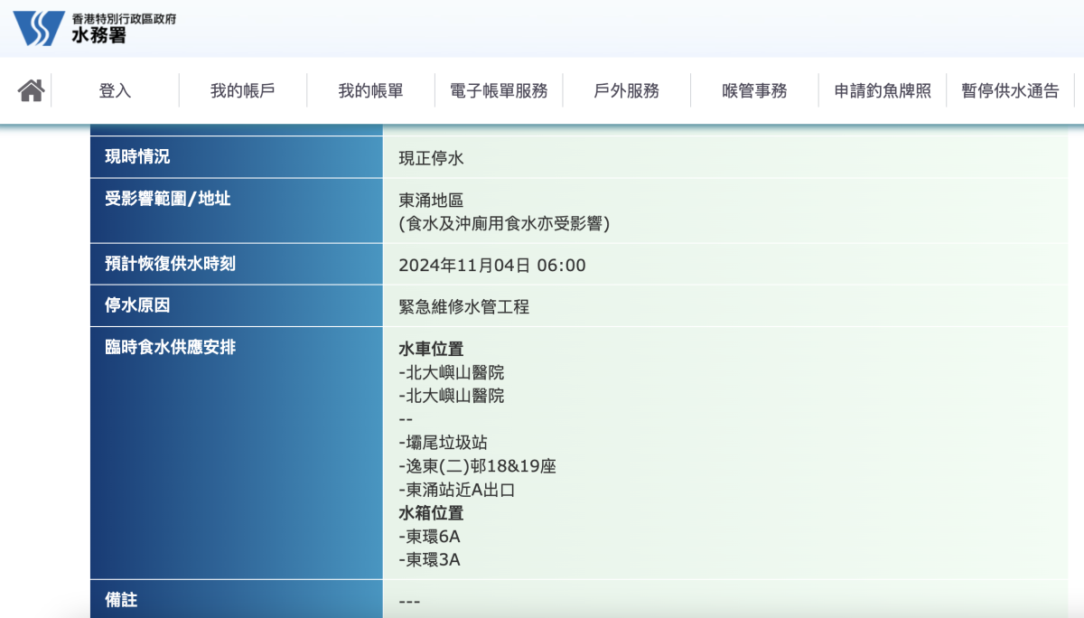 水務署表示,工程團隊現正全力進行搶修,預計明日早上6時陸續恢復供水。署方已安排水車及水箱為該區居民及商戶提供臨時食水供應,水車位置分別位於北大嶼山醫院、喜東街、東涌站近A出口、逸東(二)邨18&19座及壩尾垃圾站。市民可點此瀏覽水務署發布最新消息。
