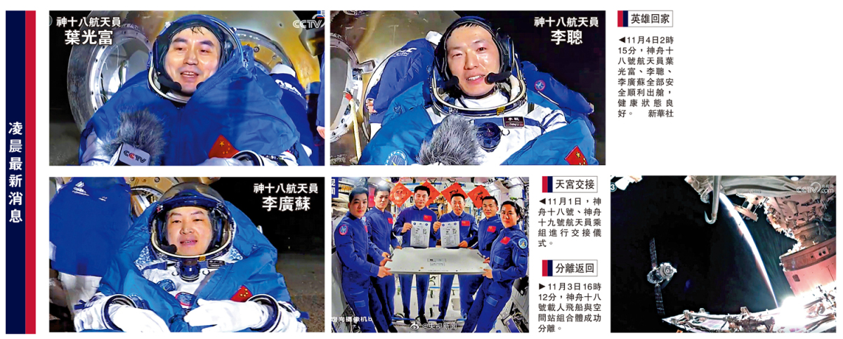 0時34分,北京航天飛行控制中心通過地面測控站發出返回指令,神舟十八號載人飛船軌道艙與返回艙成功分離。之後,飛船返回制動發動機點火,返回艙與推進艙分離,返回艙成功着陸,擔負搜救回收任務的搜救分隊及時發現目標並抵達着陸現場。返回艙艙門打開後,醫監醫保人員確認航天員身體健康。
