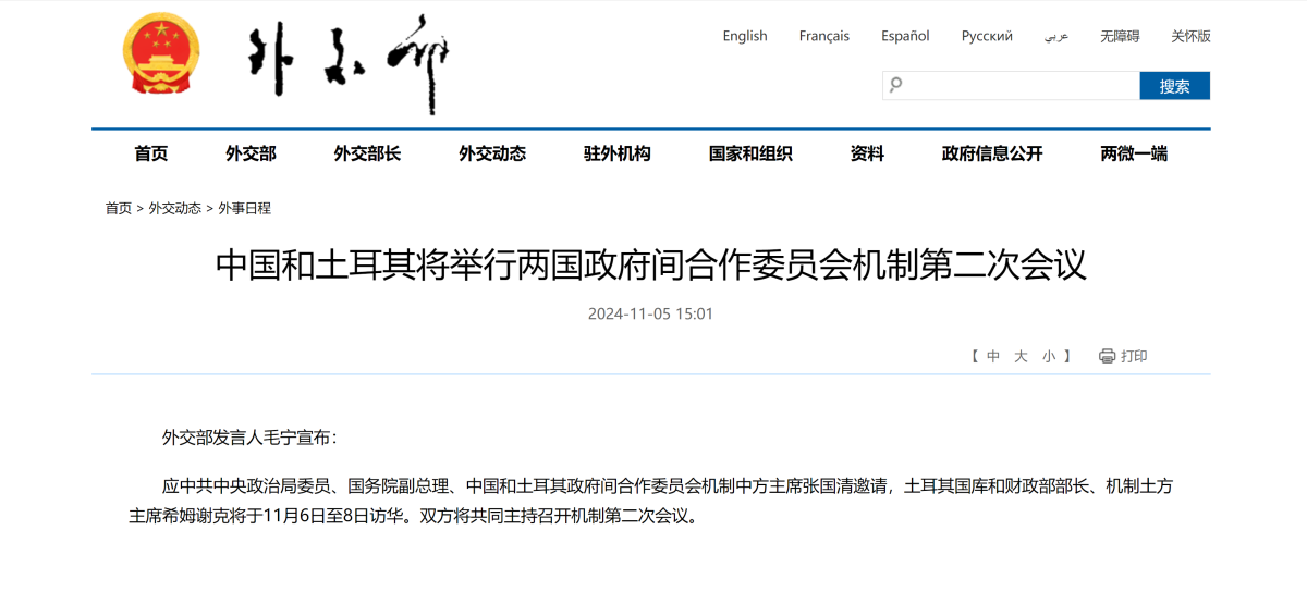 據外交部官網消息,外交部發言人毛寧宣布,應中共中央政治局委員、國務院副總理、中國和土耳其政府間合作委員會機制中方主席張國清邀請,土耳其國庫和財政部部長、機制土方主席希姆謝克將於11月6日至8日訪華。雙方將共同主持召開機制第二次會議。