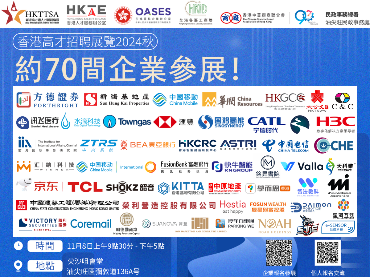 【點新聞報道】由香港高才通人才服務協會主辦的「香港高才就業展覽2024秋」將於後日(8日)在尖沙咀會堂舉行,超過70家知名企業參展,涵蓋多個行業領域,提供高達2500個高端職位空缺,更有機會與企業高層及HR面對面交流。