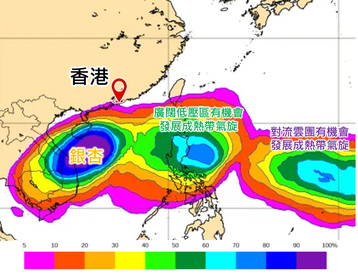 天文台表示,現時菲律賓以東一個廣闊低壓區正為該區帶來不穩定天氣,但最新電腦模式對未來發展及移動路徑的預測分歧頗大,在東面的對流雲團亦有機會發展,但仍存在相當大不確定性。