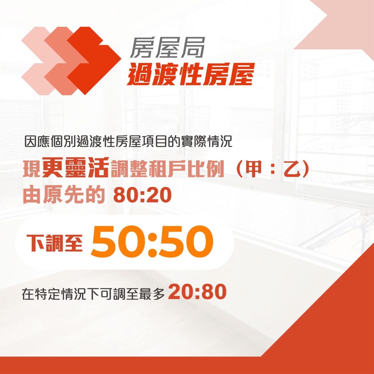 何永賢表示,自上月底開始,房屋局已向營運過渡性房屋的機構公布,因應個別項目的實際情況,可以更靈活調整甲乙類租戶比例,由早前的80︰20下調至最多50︰50,進一步放寬至在特定情況下可下調至最多20︰80。