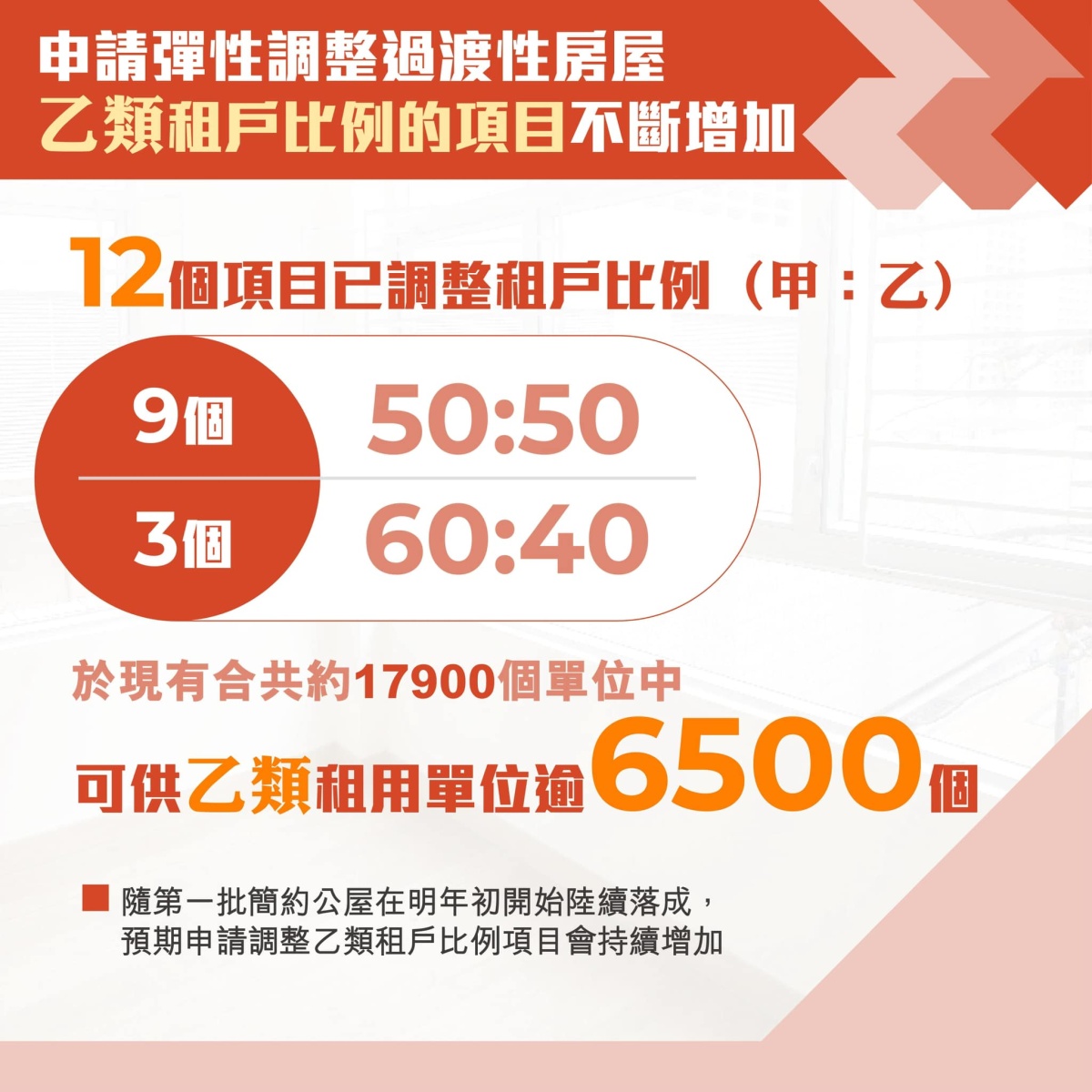 房屋局預期申請調整乙類租戶比例的項目會持續增加,令簡約公屋和過渡性房屋有更好分工,相輔相成,全面照顧更多有迫切需要的基層市民。