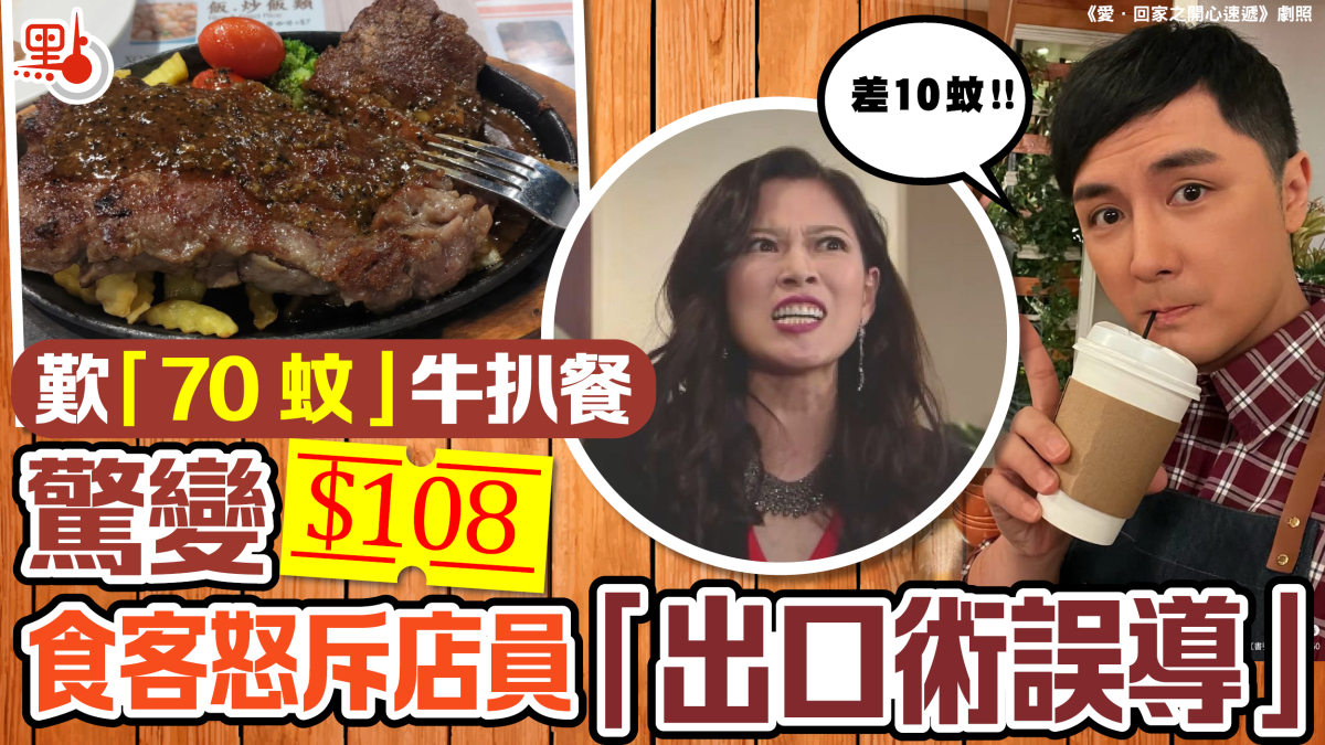 上菜時,原來肉眼扒餐會送一塊多士,樓主認為「這已顯示店員自打咀巴,沒有多士類食物何來跟餐送多士?」到結賬時,樓主發現「該肉眼扒餐標價是$108而不是$70」,即時向店員查詢,對方解釋只是回答「差十蚊」,並不是讀音相近的「70蚊」,意指該套餐比原價118元「差十蚊」,即便宜了10元,售108元。樓主怒指該店員「你唔答$108又或『平十蚊』」,認為該餐廳和店員用出口術這一招,直嘆「一心幫襯下小店,誰知換來一肚氣。」