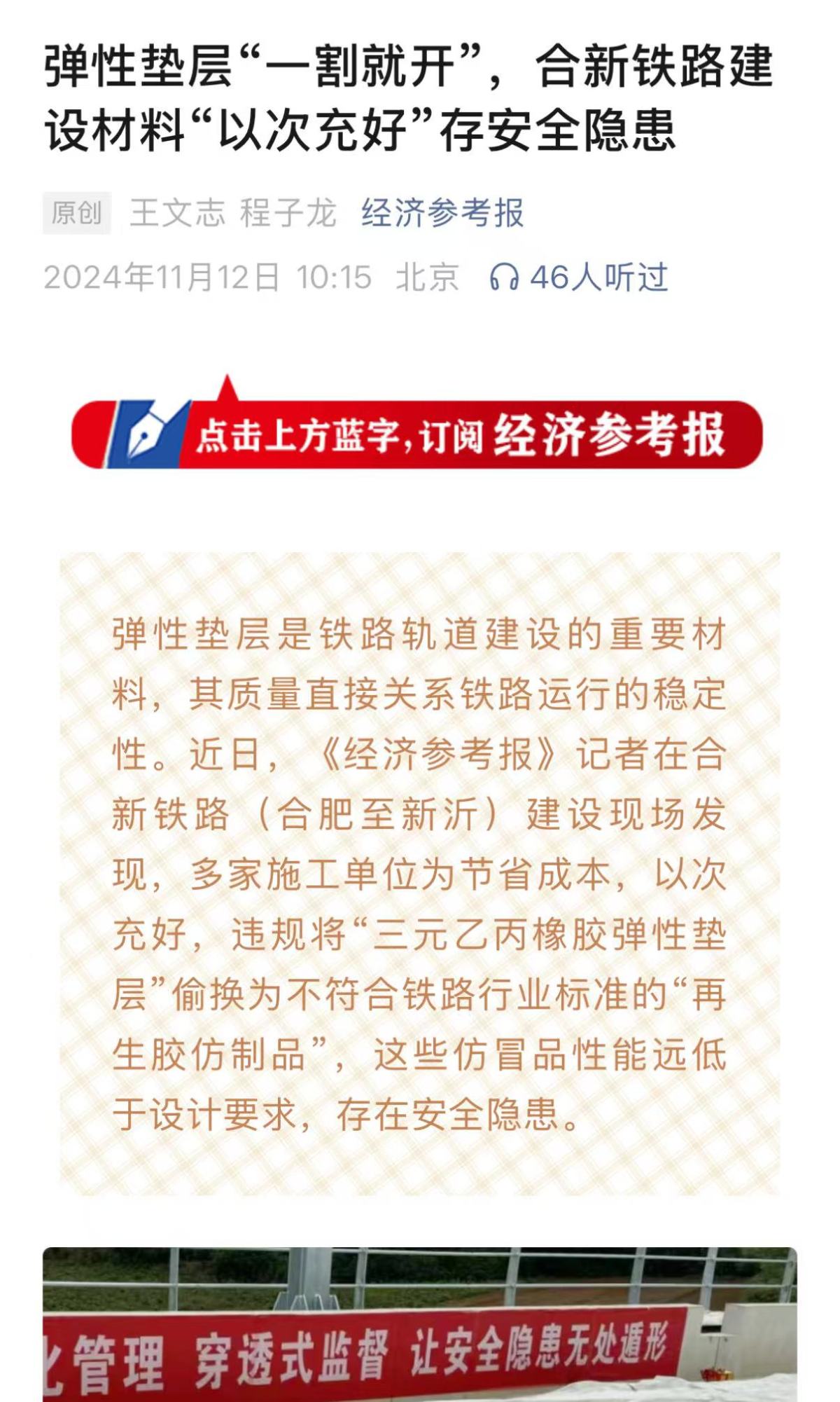 11月12日(星期二),新華社《經濟參考報》刊發調查報道《彈性墊層「一割就開」,合新鐵路建設材料「以次充好」存安全隱患》一文。