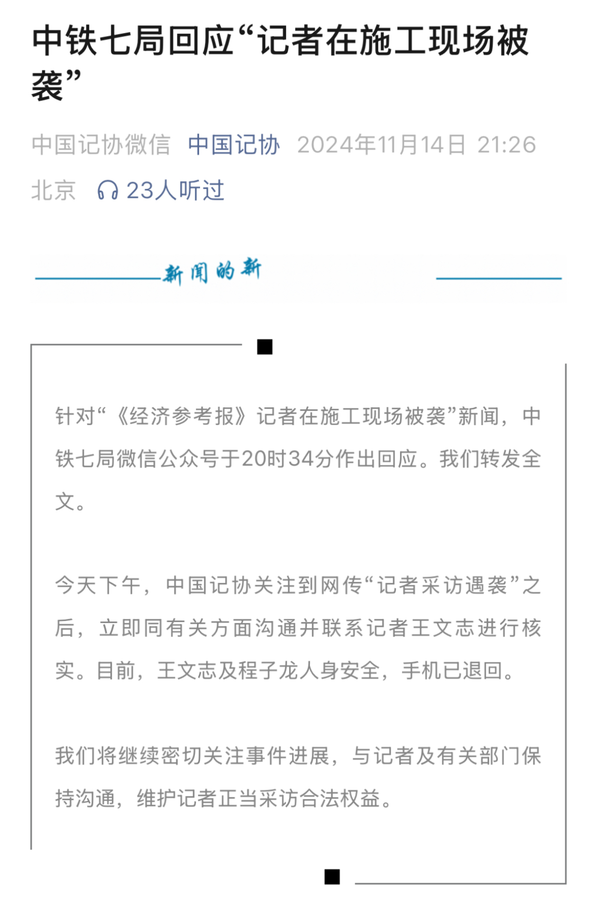 此外,今日下午,中國記協關注到網傳「記者採訪遇襲」之後,立即同有關方面溝通並聯繫記者王文志進行核實。
