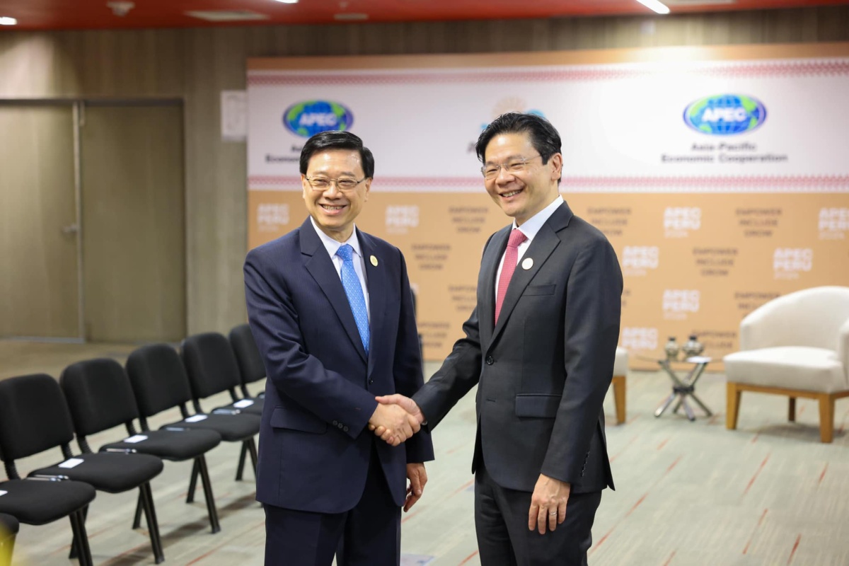 【點新聞報道】行政長官李家超在秘魯利馬展開訪問行程。李家超今日(16日)在社交平台發文表示,APEC會議期間,很高興與新加坡總理黃循財進行會面。他首先祝賀黃循財於今年5月就任新加坡總理,並感謝新加坡一直表示支持香港申請加入《區域全面經濟夥伴關係協定》(RCEP)。