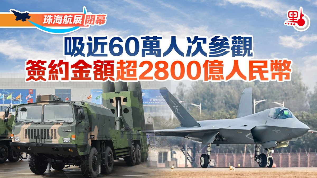 【點新聞報道】第十五屆珠海航展今日(17日)閉幕。主辦方透露,在為期6天的展覽中,共簽訂總值約2856億人民幣(約3074億港元)合作協議,成交各種型號飛機1195架,吸引近60萬人參觀。