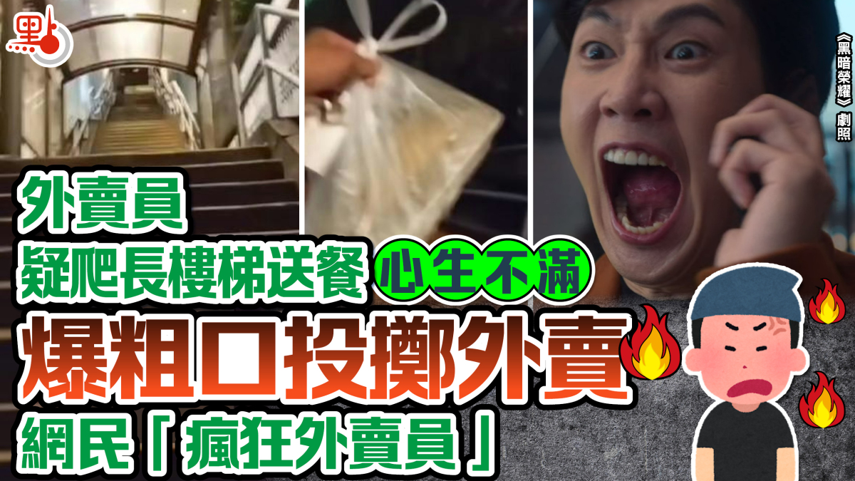 【點新聞報道】日前網傳一段影片,外賣員為了送1份餐,而要步上觀塘功樂道超長樓梯到達大廈。他邊行邊爆粗,到大廈大閘前,客戶又不應機。畫面一轉,見到外賣員疑上到單位前,從遠方把整袋外賣大力擲向單位大門,外賣再掉在地上,發泄完畢後離開。該片引起網民熱議,紛紛指責外賣員的態度「瘋狂外賣員」。但也有人質疑該片真假,「剪接嚟啫,最尾嗰下都唔似喺香港,網上啲片真係唔使太認真」。