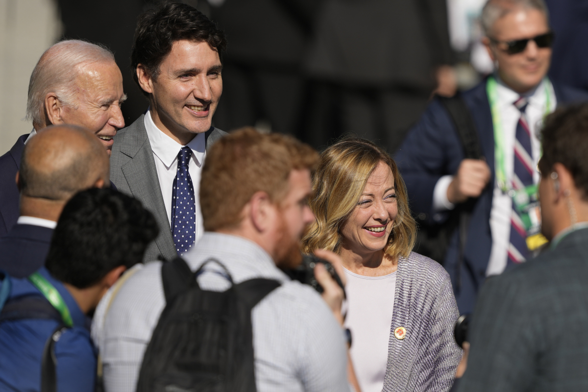 「姍姍來遲」的拜登和特魯多一同抵達了拍攝地點,但當時主辦方攝影師已拍完了照片。最終,同樣錯過合影的意大利總理梅洛尼、拜登和特魯多站在旁邊觀望了一會。