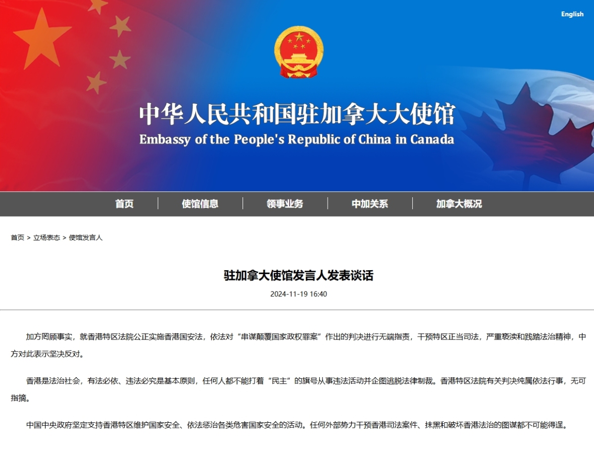 【點新聞報道】中國駐加拿大大使館發表聲明指,加方罔顧事實,就香港特區法院公正實施香港國安法,依法對「串謀顛覆國家政權罪案」作出的判決進行無端指責,干預特區正當司法,嚴重褻瀆和踐踏法治精神,中方對此表示堅決反對。