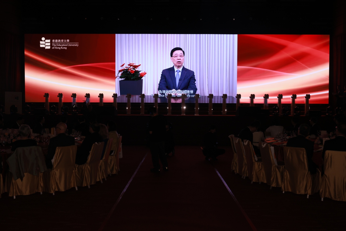 香港特區行政長官兼教大校監李家超為晚宴視像致辭,他首先祝願教大繼往開來,更進一步。他說,特區政府正全力發展香港成為國際專上教育樞紐,上個月發表其任內的第三份施政報告,便提出一系列措施,為香港培育更多優秀的專業人才,其中包括持續優化培訓教師的舉措,以支持教師專業長遠發展。李家超強調會持續優化專上教育,鼓勵教資會資助大學開辦與香港未來經濟發展有更大關連的課程。展望未來,他相信教大將秉持三十周年校慶「育才弘教 立德樹人」的主題,為香港啟發更多教育專才,為國家和香港高質量發展作出更大貢獻。