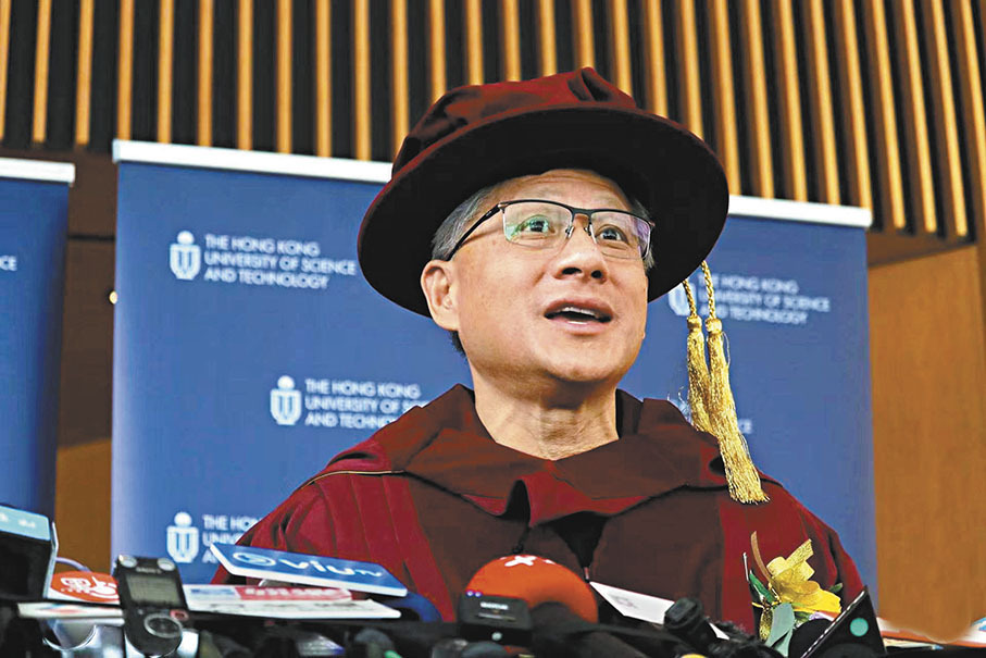 (香港文匯報記者 金文博)全球步入人工智能(AI)時代,AI引領着科學和社會各方面的革新,香港以至全中國於AI發展和研究佔據了關鍵位置。人工智能晶片龍頭企業NVIDIA(英偉達)創辦人暨執行長黃仁勳,昨日獲香港科技大學頒授榮譽博士學位。他在頒授典禮及其後的訪問分享時,讚揚香港的AI發展屬世界級,研究備受認可,使香港成為一個「超凡(extraordinary)」的地方,並認為香港和內地在AI領域的研究正處於世界領先地位,預期該情況會持續下去,在未來沒有任何事情能夠阻擋。他又提到,英偉達在25年前已進軍中國,受益於粵港澳大灣區的發展,對能夠見證中國形成令人驚嘆的科技產業,他感到榮幸。