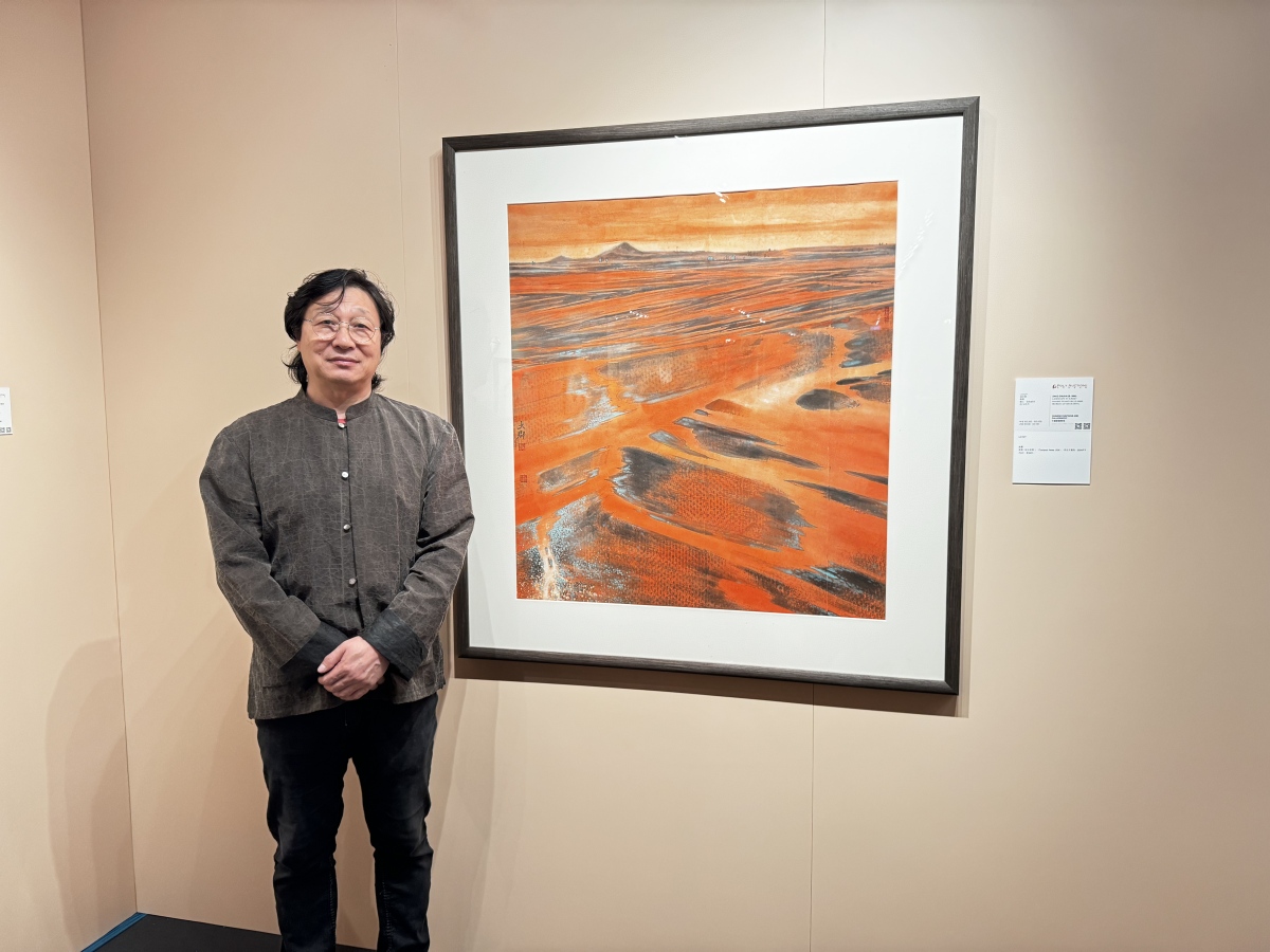 此次《匯聚》亮相是由藏家推出。受藏家委託,趙志軍跟點新聞記者分享作品背後的創作理念。「這幅畫作以溫暖的橙紅色調作為主旋律,營造出一種寧靜祥和的晨曦時分。遠處的山丘輪廓在天際線上勾勒出視覺焦點,廣闊的空間亦可能是一片平靜的水面或無垠的荒原——被簡潔而有力的筆觸填滿,渲染出深邃溪流匯聚成河的氛圍,傳達出人類文明的孕育之源,也充分體現出熱愛生活、熱愛自然的心境。」