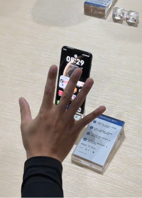 另外,Mate70系列推出與蘋果同款的「隔空取物」功能也令一眾「花粉」驚喜。華為終端BG董事長余承東早前在Mate70預熱視頻示範新機「AI隔空傳送」功能,觸發手勢同蘋果一樣為抓取和放下。有用家在線下操作,將手機上的相片通過手勢抓取隔空放入另一台手機。