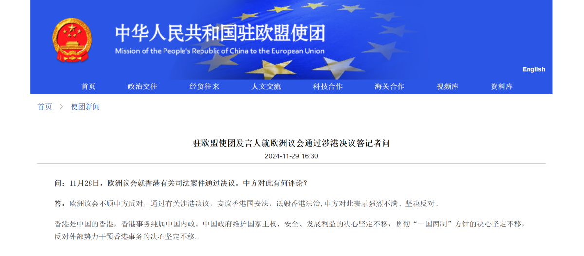【點新聞報道】中國駐歐盟使團11月29日回應歐洲議會涉港決議,強調香港事務純屬中國內政,中國政府反對外部勢力干預香港事務的決心堅定不移。