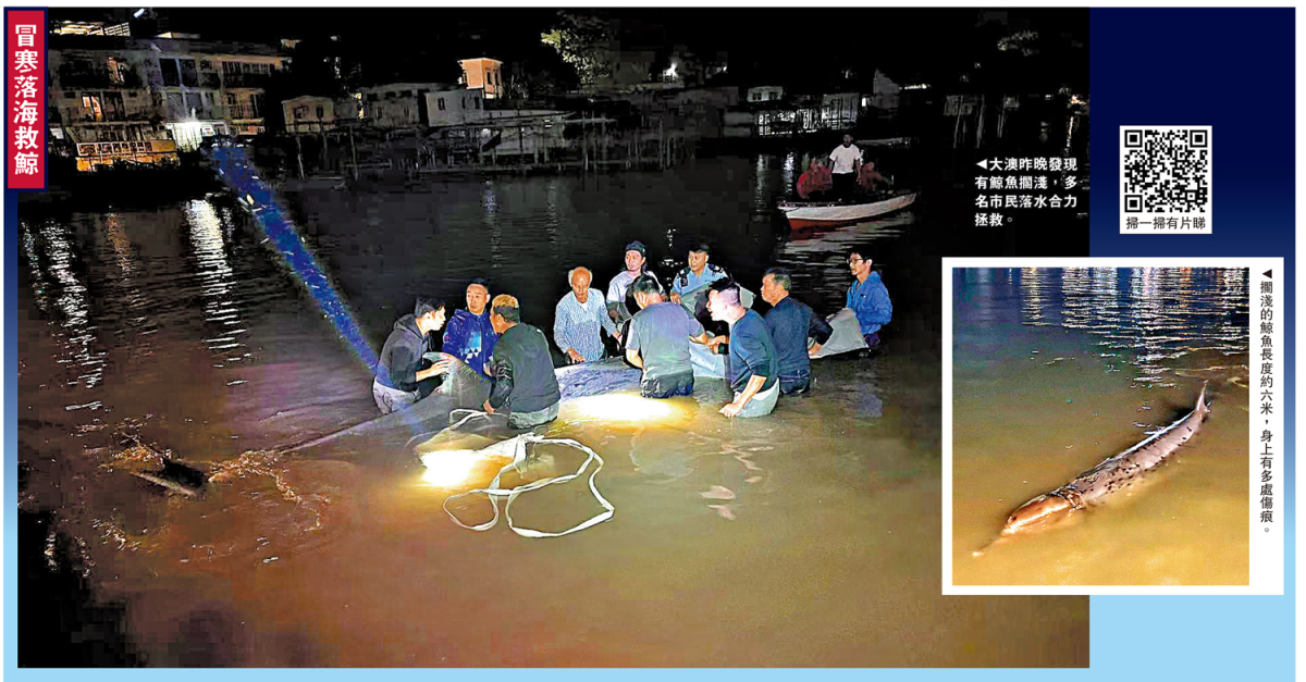 一條約6米長受傷鯨魚在本港大澳水域擱淺,各方昨日(11月30日)連夜展開救援行動。聞訊而至的街坊及漁民自發走落水深及腰的海中嘗試為鯨魚解困,「睇下可唔可以拖返佢(鯨魚)出海」。當地村長告訴大公報記者,村民昨晚7時多已在現場幫助救援,「用不同的帆布袋兜住魚身,令鯨魚不會再摩擦到泥石。」