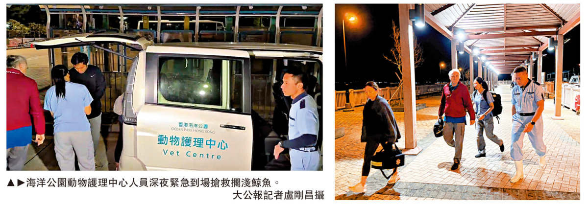漁護署昨晚啟動「應變計劃」拯救,專家夜奔現場,評估鯨魚身體狀況,緊急救助,獸醫即場為鯨魚打針保命。有專家表示,擱淺鯨魚疑似朗氏印太喙鯨,在香港水域罕見。記者目擊,受傷鯨魚在今日凌晨約1點許由船隻慢慢拖向海中心,但吉凶難料。