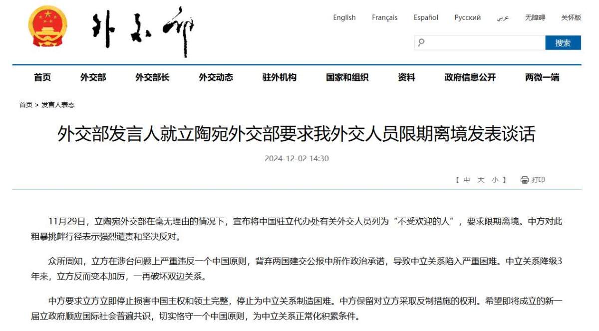 【點新聞報道】據外交部網站消息,11月29日,立陶宛外交部在毫無理由的情況下,宣布將中國駐立代辦處有關外交人員列為「不受歡迎的人」,要求限期離境。中方對此粗暴挑釁行徑表示強烈譴責和堅決反對。