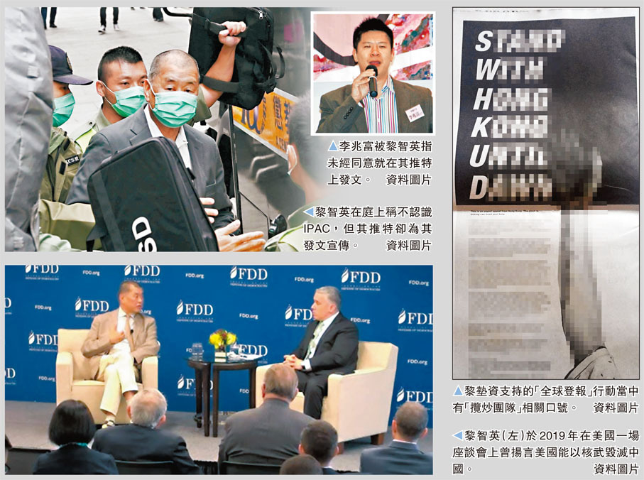 辯方昨圍繞黎智英的Twitter帖文,以及黎與其Twitter賬戶管理人李兆富之間的通訊提問。其中2020年6月13日,黎在Twitter分享《華爾街日報》的報道「全球立法者聯盟面臨對抗中國的挑戰」,並在帖文標籤(hashtag)「對華政策跨國議會聯盟」(IPAC),以及《香港安全港法案》(Hong Kong Safe Harbor Act)及《香港人民自由和選擇法案》(Hong Kong People's Freedom and Choice Act)等轉載自IPAC的帖文等。