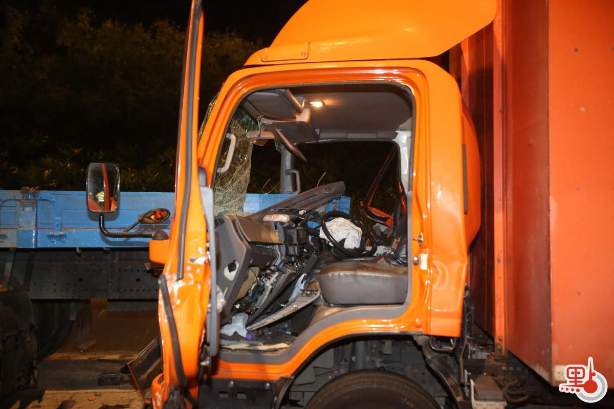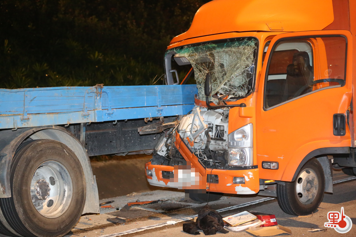 現場圖片可見,涉事5.5噸貨車車頭嚴重毀爛,插入30噸貨車車尾,安全氣袋彈出。涉事車頭散落一地雜物,包括一個時鐘、一件衣服及紙盒。消息稱,30噸貨車為泊於路邊的「死車」,有目擊者見到5.5噸貨車駛至現場時疑未有收掣,直插該車車尾。