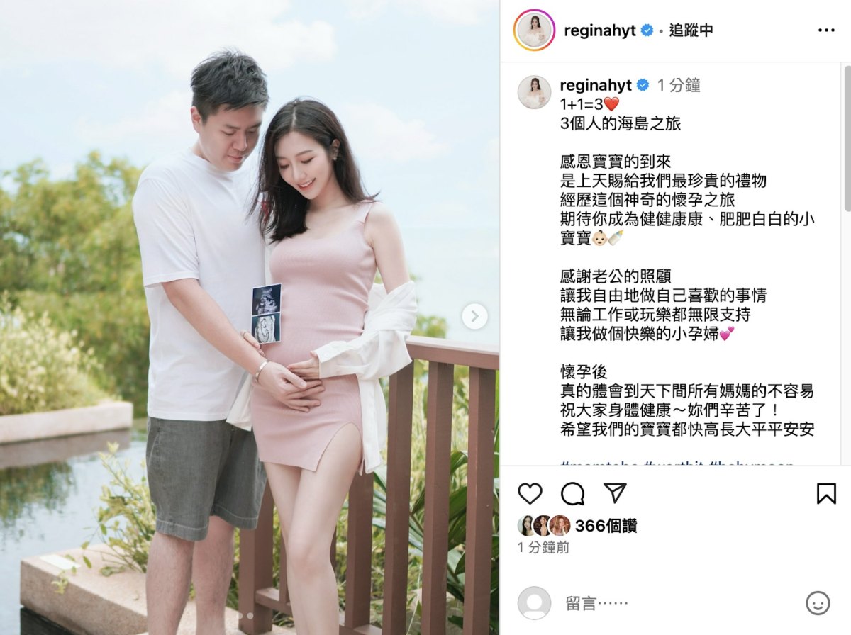 何依婷其後亦在IG發文正式公布喜訊:「1+1=3。3個人的海島之旅,感恩寶寶的到來,是上天賜給我們最珍貴的禮物,經歷這個神奇的懷孕之旅,期待你成為健健康康、肥肥白白的小寶寶。感謝老公的照顧,讓我自由地做自己喜歡的事情,無論工作或玩樂都無限支持,令我成為一個快樂的小孕婦。懷孕後,真的體會到天下間所有媽媽的不容易,祝大家身體健康~妳們辛苦了!」