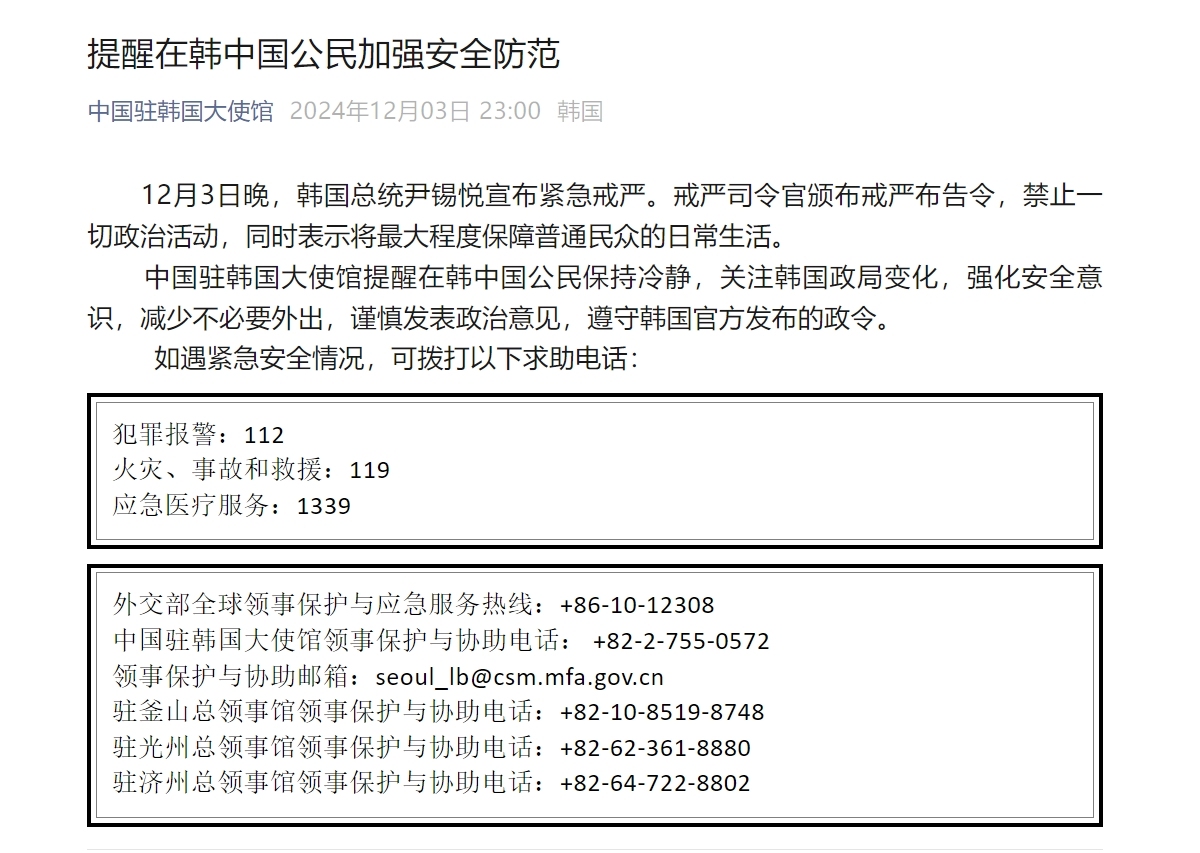 中國駐韓國大使館提醒在韓中國公民保持冷靜,關注韓國政局變化,強化安全意識,減少不必要外出,謹慎發表政治意見,遵守韓國官方發布的政令。