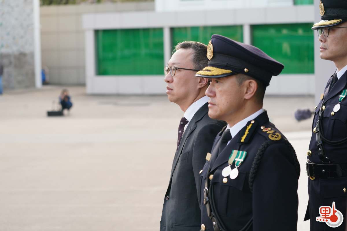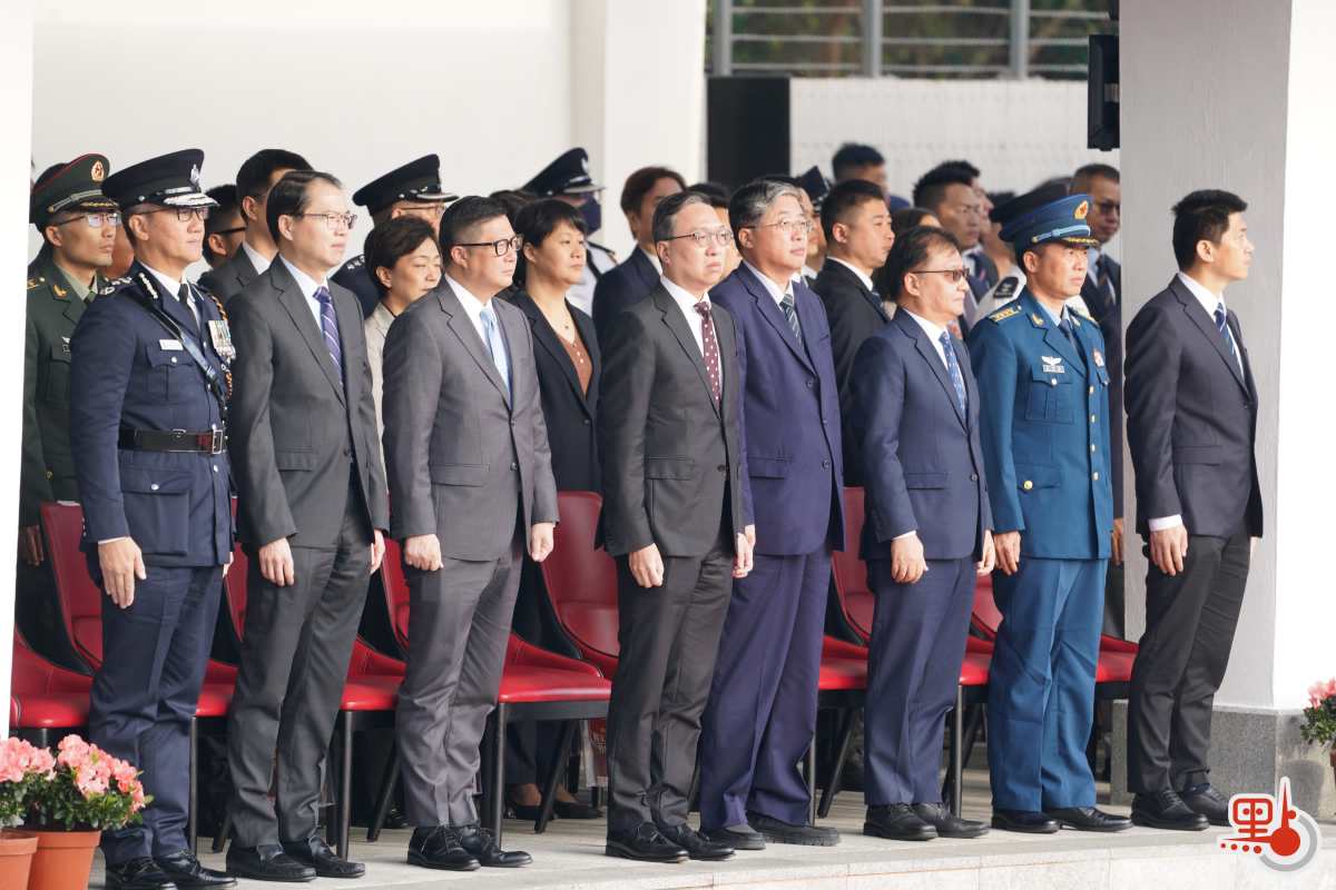 【點新聞報道】12月4日是國家憲法日。保安局帶領轄下紀律部隊今日(4日)上午在香港海關學院舉行國家憲法日升旗儀式,律政司司長林定國為升旗儀式主禮,逾百人的紀律部隊儀仗隊及護旗方隊以中式步操進場並進行升旗儀式,現場奏唱國歌,政府飛行服務隊直升機在空中敬禮,海關樂隊接着表演軍樂操為儀式作結。
