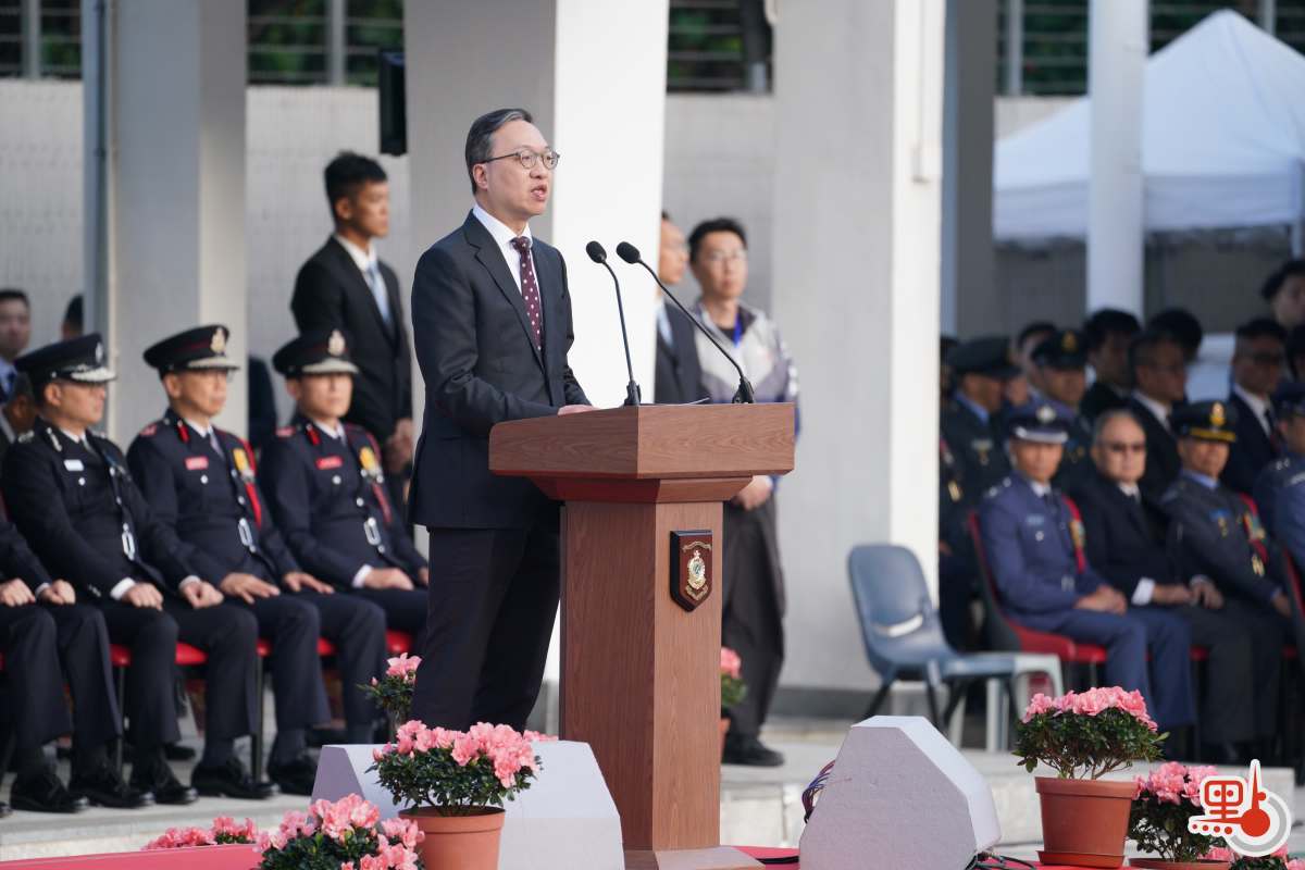 林定國致辭時表示,「國家憲法日」已踏入第二個十年。香港的憲制秩序是以憲法和基本法為基礎,是香港的「根」和「源」。憲法為「一國兩制」提供了法律上最根本及堅實的保障,香港要充分利用「一國兩制」下享有的所有獨特優勢,維護國家主權、安全和發展利益,保持香港長期繁榮穩定。他指出,憲法意識應該從小培養,紀律部隊成員亦要當好憲法的守護者和捍衛者,盡心盡力履行維護國家安全的責任。