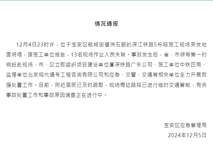 【點新聞報道】深圳市寶安區區委宣傳部官方微信公眾號「濱海寶安」5日發布情況通報:12月4日23時許,位於寶安區航城街道洲石路的深江鐵路5標段施工現場突發地面坍塌,接施工單位報告,13名現場作業人員失聯。
