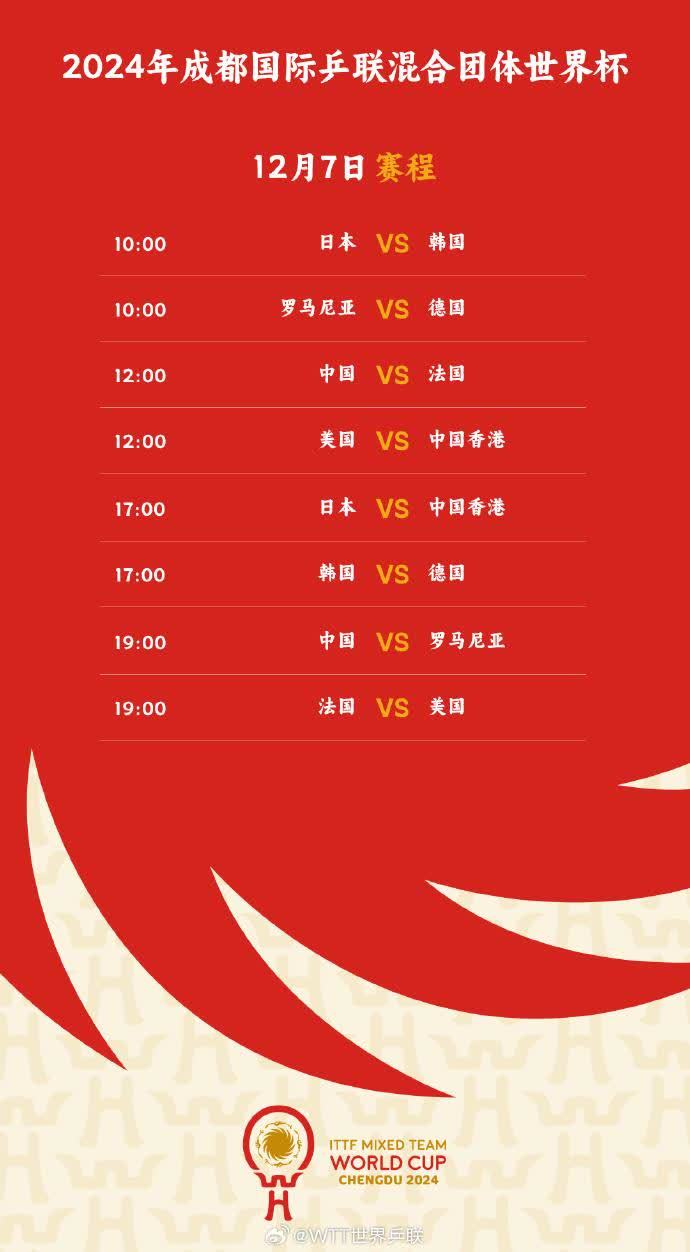 12月7日,中國隊將於12時對戰法國隊,19時對戰羅馬尼亞隊。