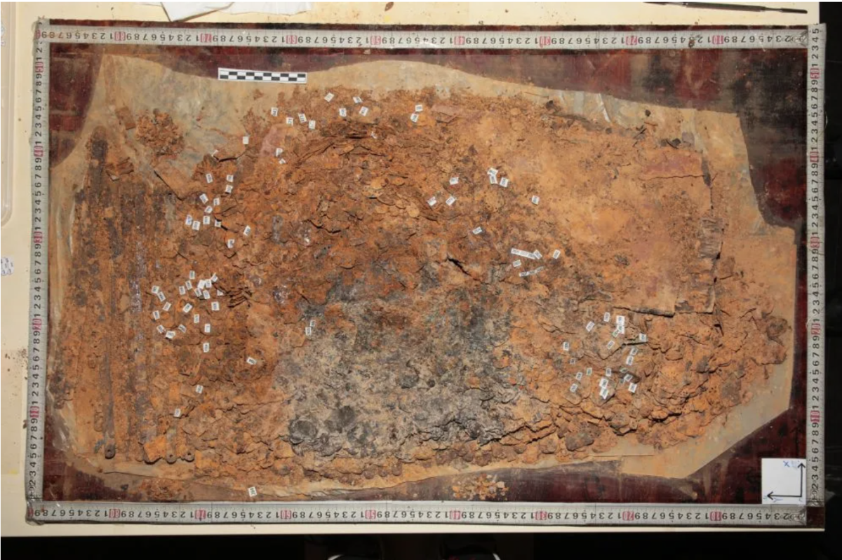 江西省文物考古研究院研究員、海昏侯墓考古發掘領隊楊軍介紹,這批甲片被發現於劉賀墓西藏槨武器庫,與刀劍伴隨出土,據現場漆皮痕跡推測,當時被裝在漆箱中。出土時漆箱已腐爛,鎧甲、刀劍呈堆砌狀,「海昏侯墓先後經歷地震、鄱陽湖水南侵造成的地下水位上升,埋藏環境導致甲片質地輕薄脆弱,我們決定對文物進行整體套箱提取,再通過實驗室考古進行保護研究」。