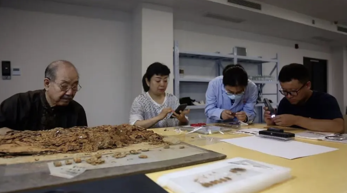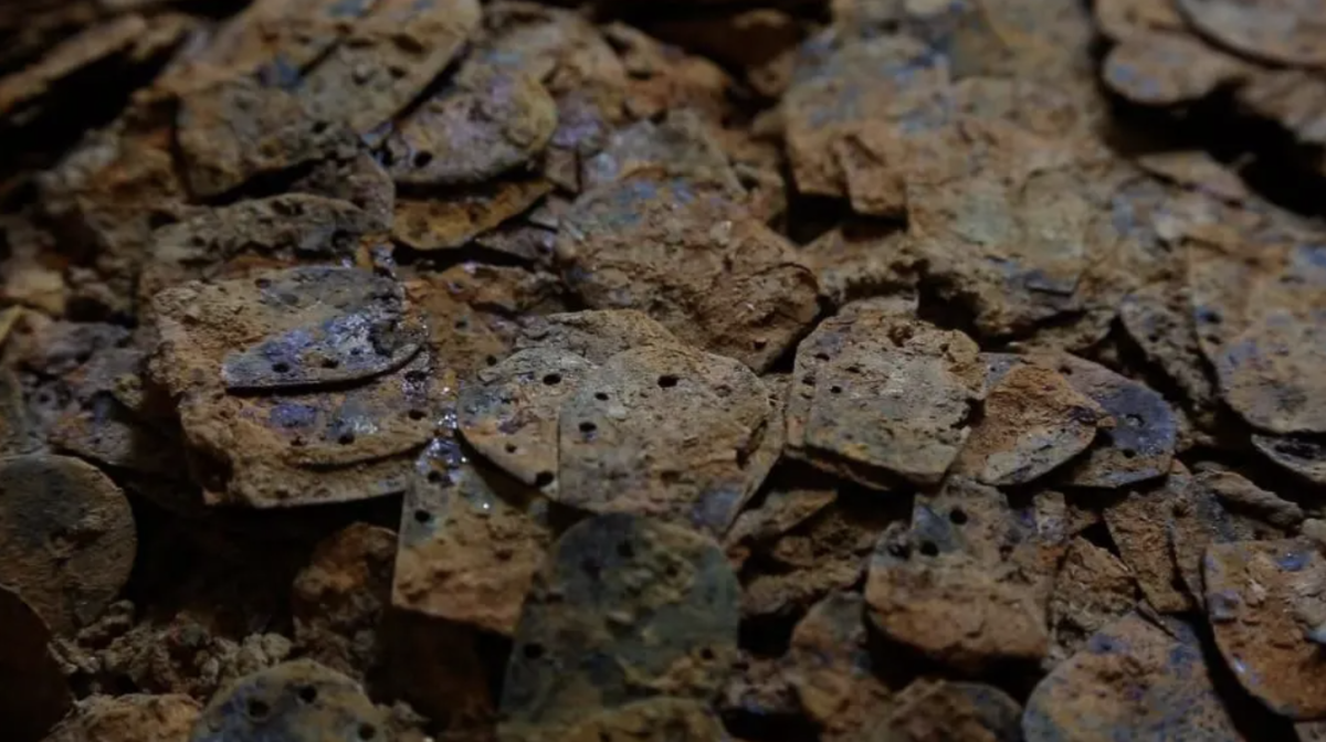 來自中國社會科學院考古研究所、科技考古與文化遺產保護重點實驗室和江西省文物考古研究院等機構的文保人員,經過兩年多時間從套箱中提取了約6000片甲片。文保人員經初步復原研究認為,劉賀墓出土的鎧甲為鐵漆、銅漆、皮漆複合材質編綴的魚鱗甲。
