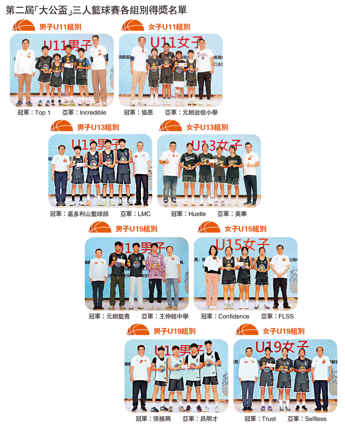 第二屆「大公盃」三人籃球賽總決賽及頒獎禮昨日(8日)於培僑書院舉行,包括3個分賽(港島、九龍及新界區)共48隊爭逐4個組別(U11、13、15、19)男女子冠軍殊榮。本屆更增設大專邀請組及全國邀請組各8隊參賽,競賽過程生龍活虎,展示了青少年昂揚奮進的新風貌。