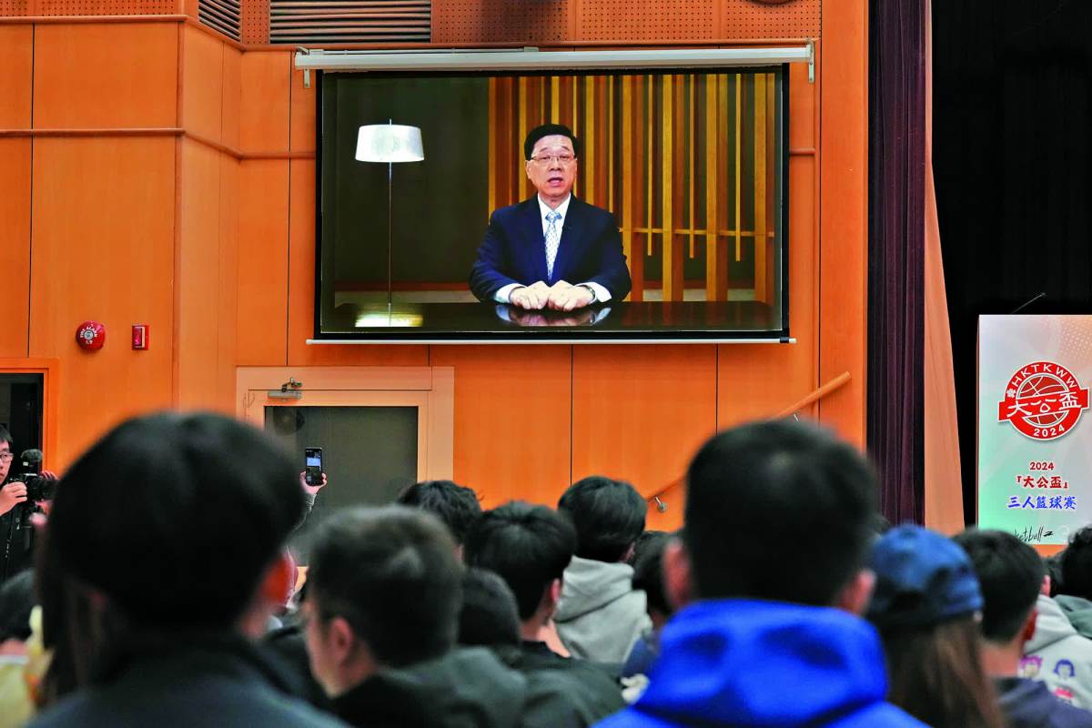 頒獎禮上,行政長官李家超透過視像致辭。李家超在視頻中祝賀本屆「大公盃」賽事圓滿舉行。李家超表示,今年的「大公盃」,不但鼓勵香港學生透過體育競技強身健體,更鞏固大灣區內地城市與香港的青年交流,非常有意義。李家超指出,體育賽事不僅能夠鍛煉身體,還可以培養運動員的意志力、協作能力及應對挑戰的能力,他並期望每一位香港青年都能夠發憤圖強、志存高遠,以拚搏奮鬥的體育精神推動本港發展。