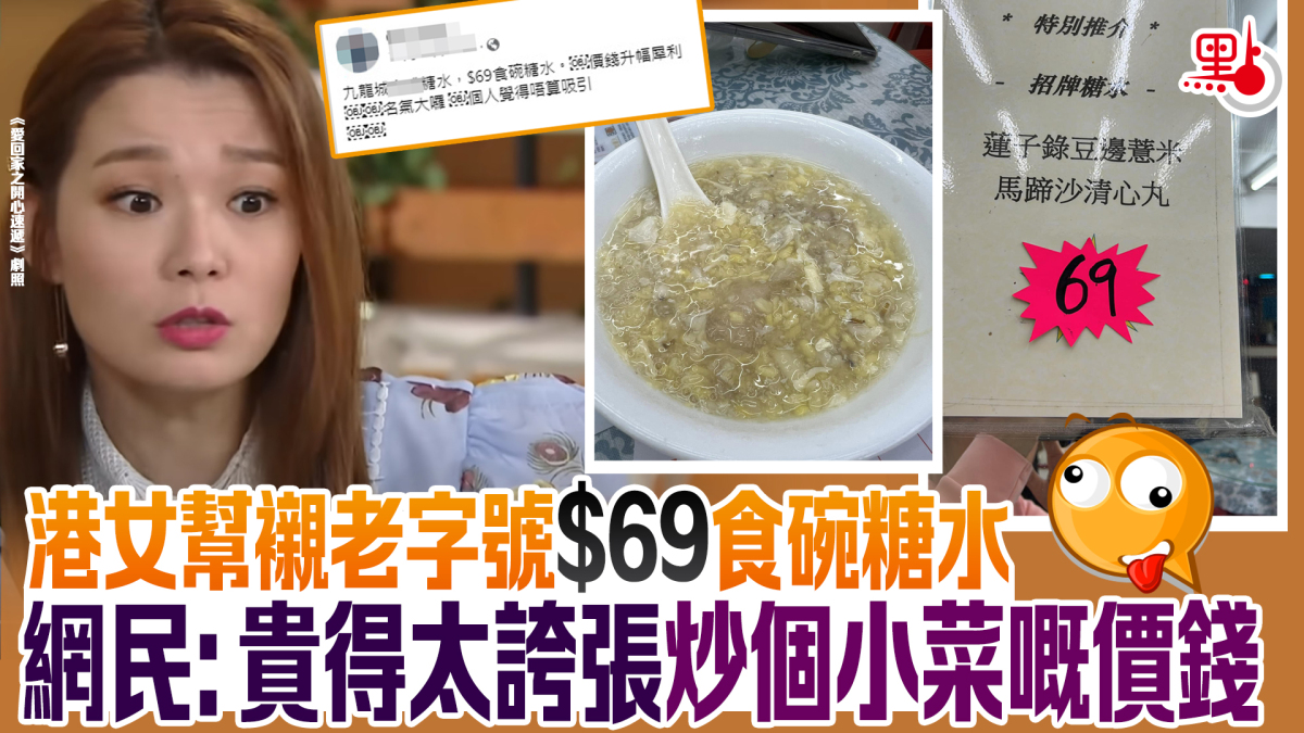 【點新聞報道】近日,天氣轉冷了,在這個寒冷的天氣吃一碗溫暖的糖水,令人暖在心頭。不過,有港女近日幫襯九龍城一間老字號糖水舖時,發現其價格大幅上升,一碗「蓮子綠豆邊薏米馬蹄沙清心丸」索價69元,直指「誇張呀!糖水賣到呢個價錢太離譜!」。