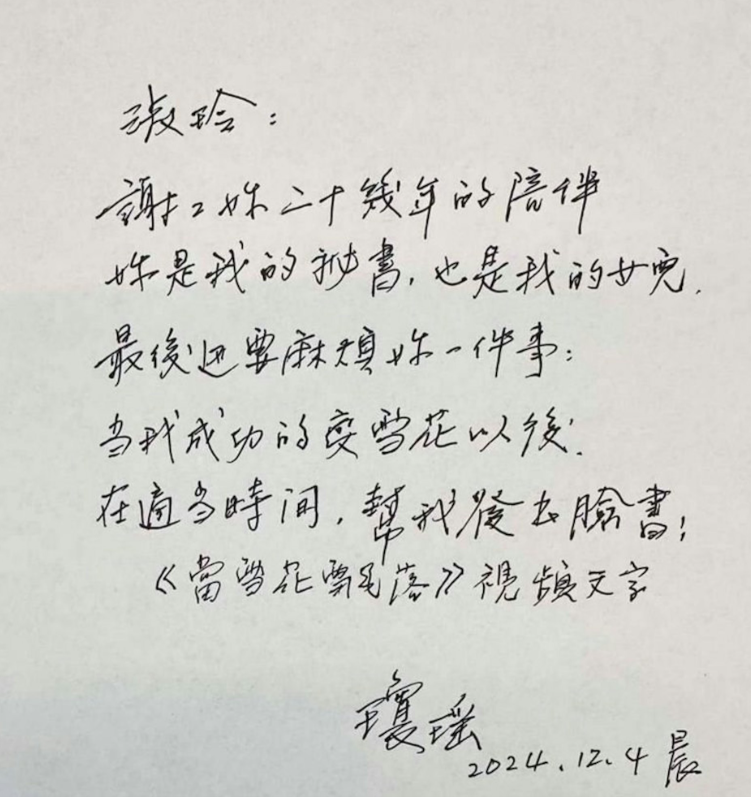瓊瑤秘書淑玲亦於瓊瑤離世多日之後,曬出瓊瑤生前寫畀自己嘅「最後一封親筆信」:「淑玲:謝謝妳20幾年的陪伴,你是我的秘書,也是我的女兒,最後也要麻煩你一件事:當我成功的變雪花以後,在適當時間,幫我發去臉書:《當雪花飄落》視頻文字。」日期寫在「2024.12.4晨」,淑玲亦用文字與瓊瑤告別:「我最摯愛的瓊瑤阿姨,這是您最後交代我的一件事情,傷心、懷念、但尊重您,現在的我真的不捨得,更無法言語,請各位朋友體諒!謝謝!」