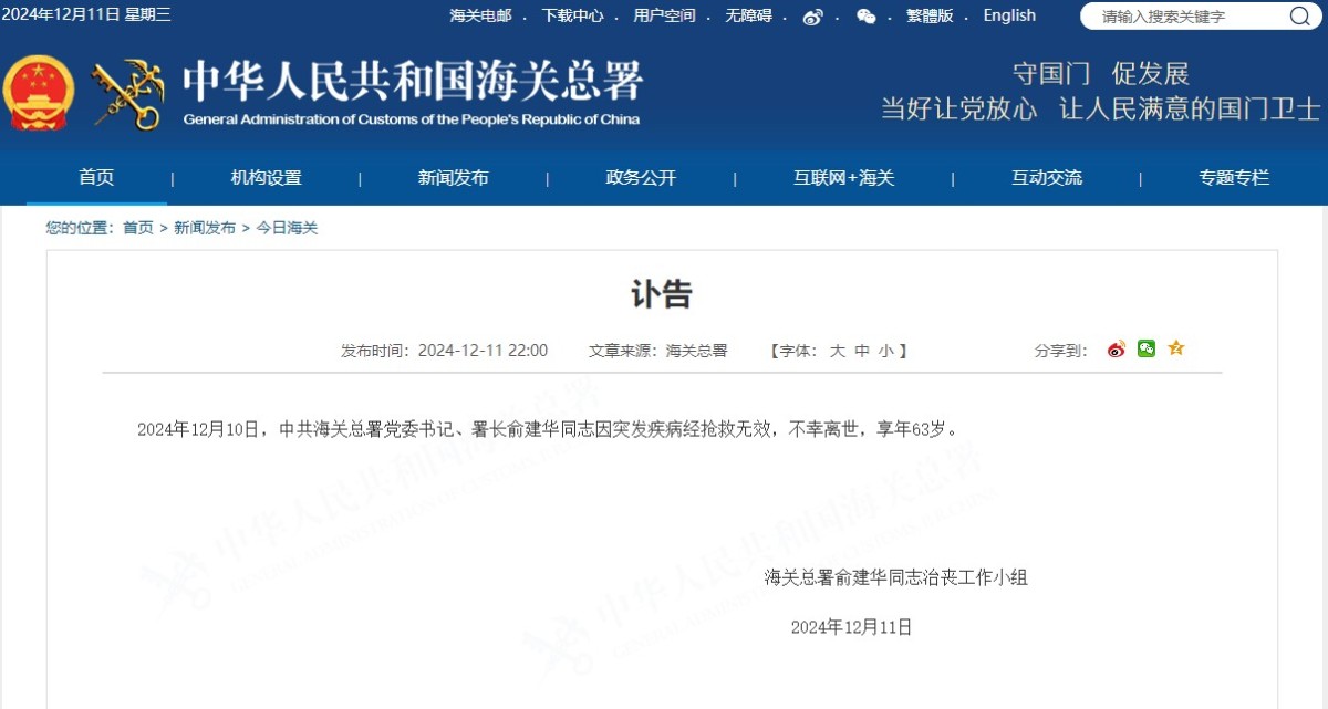 【點新聞報道】據海關總署官網消息,2024年12月10日,中共海關總署黨委書記、署長俞建華同志因突發疾病經搶救無效,不幸離世,享年63歲。