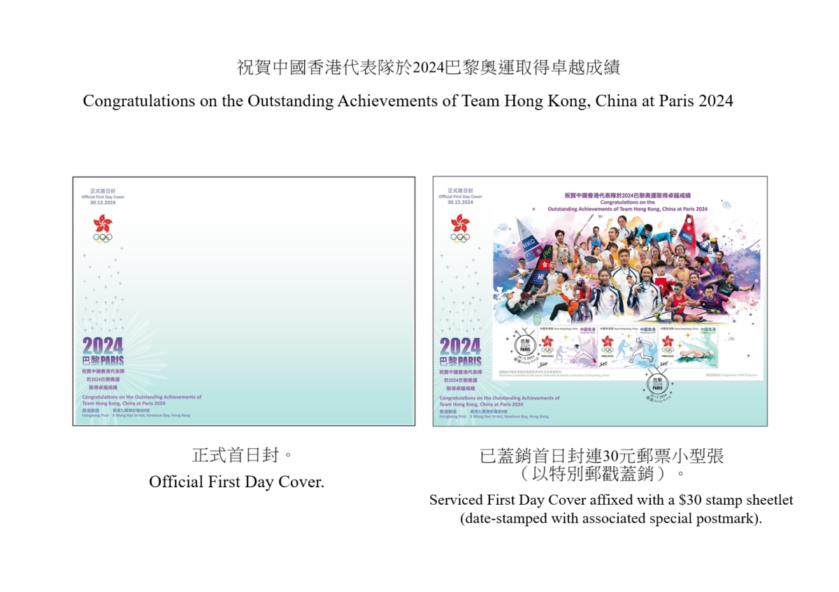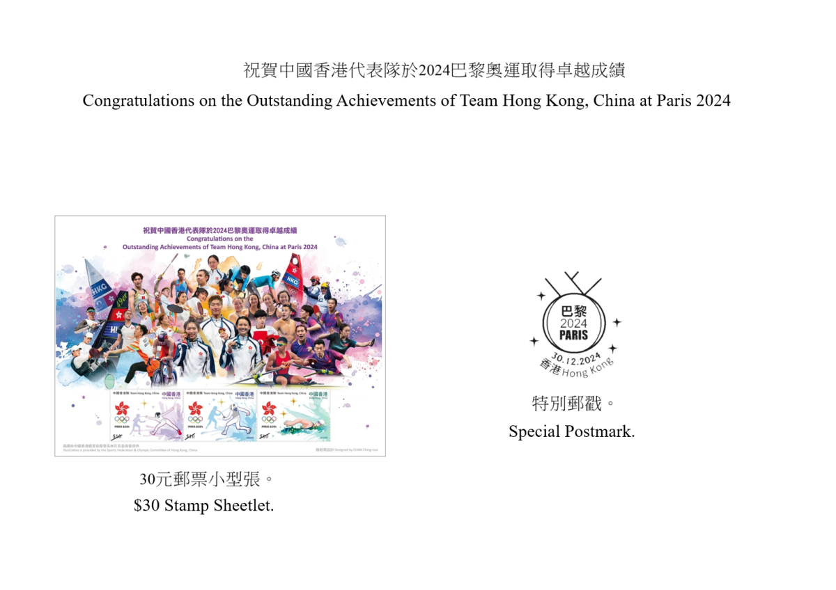 【點新聞報道】香港郵政今日(12日)宣布,以「祝賀中國香港代表隊於2024巴黎奧運取得卓越成績」及「祝賀中國香港代表隊於2024巴黎殘疾人奧運會取得卓越成績」為題的郵票小型張及相關郵品將於12月30日(星期一)推出發售。