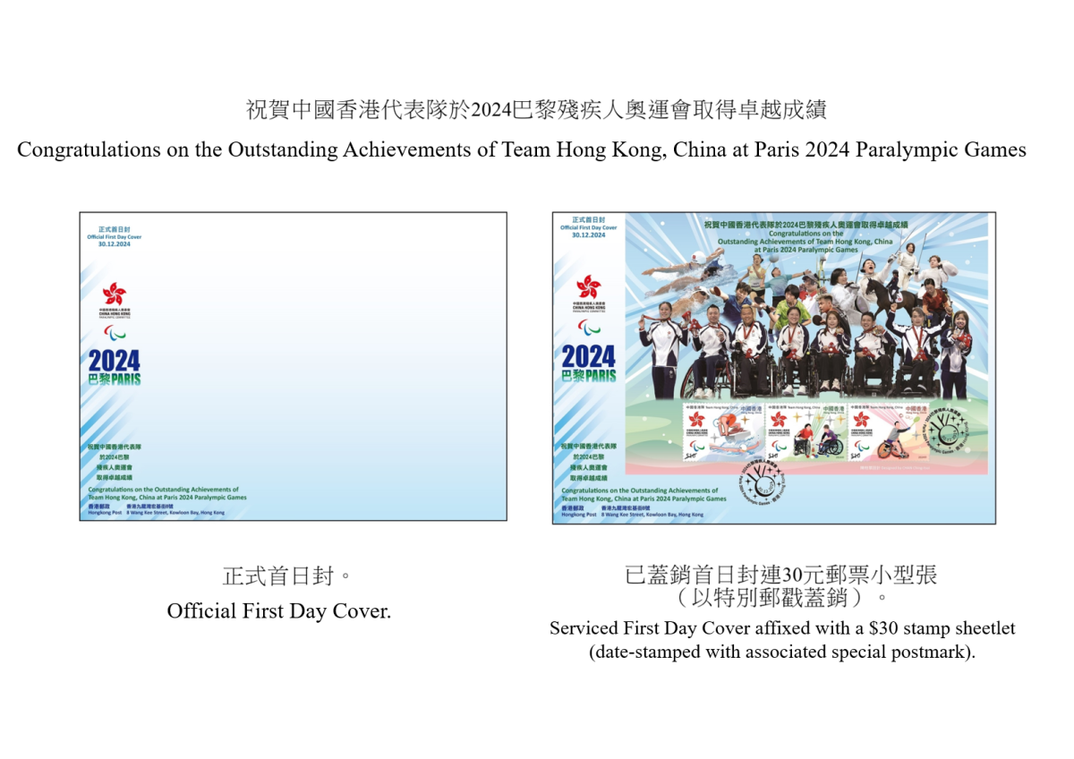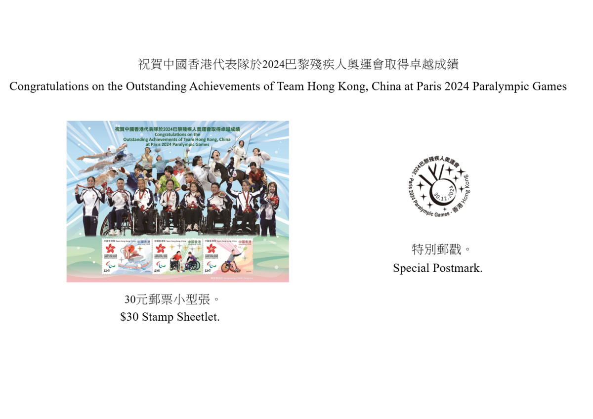 此外,中國香港代表隊亦在巴黎殘奧會中以3面金牌、4面銀牌及1面銅牌的優異成績完成今屆賽事,創下繼2008年殘奧會後的最佳成績。為了慶祝中國香港代表隊在今屆殘奧會的超卓表現,香港郵政將發行一張以「祝賀中國香港代表隊於2024巴黎殘疾人奧運會取得卓越成績」為題的郵票小型張及相關集郵品。郵票小型張嵌有一套3枚郵票,分別展示游泳、硬地滾球和羽毛球3個得獎運動項目。每位運動員憑着無比毅力和鬥志,克服種種障礙,堅持刻苦訓練,最終能出戰殘奧會,令全港市民深感鼓舞和自豪。