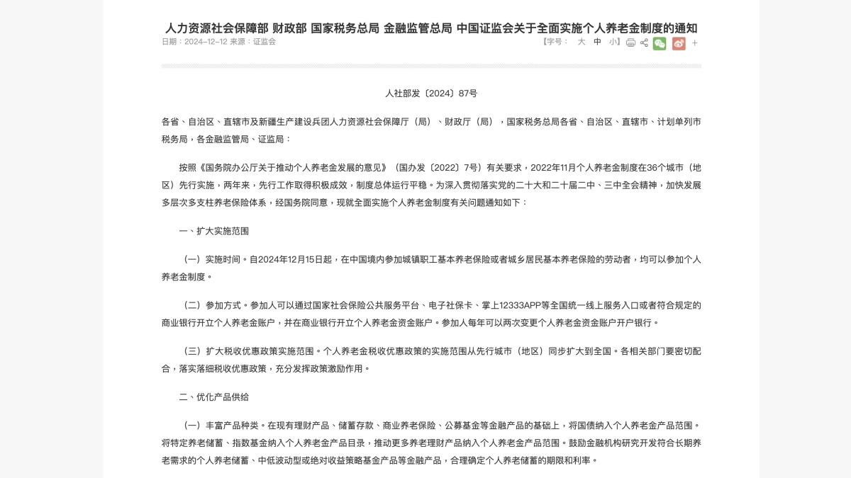【點新聞報道】12月12日,人力資源社會保障部、財政部、國家稅務總局、金融監管總局、中國證監會印發《關於全面實施個人養老金制度的通知》。《通知》明確,自12月15日起個人養老金制度從36個先行試點城市(地區)推開至全國。