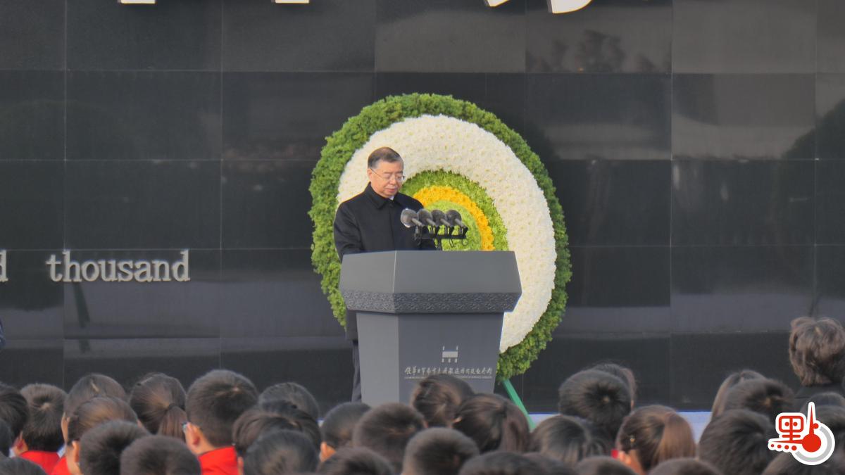 隨後,解放軍儀仗隊向死難同胞敬獻花圈,中共中央政治局委員、中宣部部長李書磊發表講話。講話結束後,南京市青少年代表宣讀《和平宣言》,中國國家游泳隊運動員、世界冠軍張雨霏,南京醫科大學第二附屬醫院院長李慶國等6名代表撞響「和平大鐘」。現場放飛3000隻和平鴿,祈求世界和平。