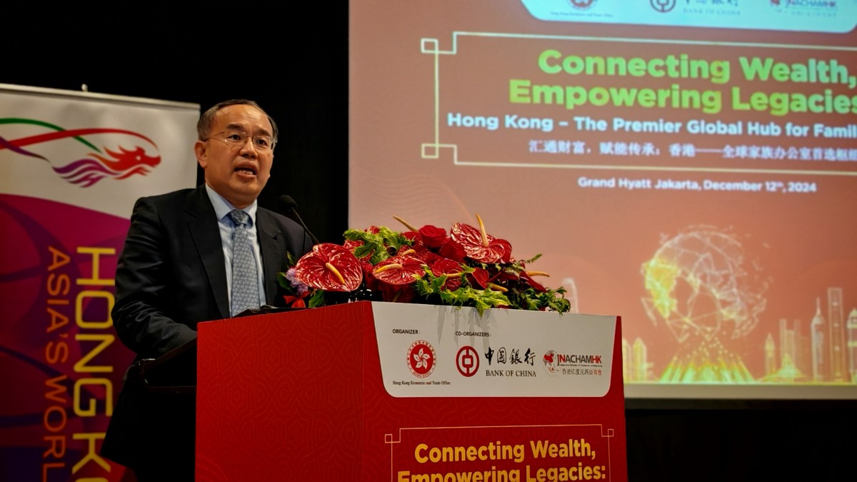 許正宇昨日出席了由香港駐雅加達經濟貿易辦事處、香港印度尼西亞商會及中國銀行(香港)有限公司雅加達分行合辦的以「匯通財富·賦能傳承:香港—全球家族首選樞紐」為主題的午餐研討會。許正宇作主題演講時,特別介紹為鞏固香港作為家族辦公室樞紐而採取的策略,並提到業內估計香港在未來數年有望成為全球規模最大的跨境財富管理中心。
