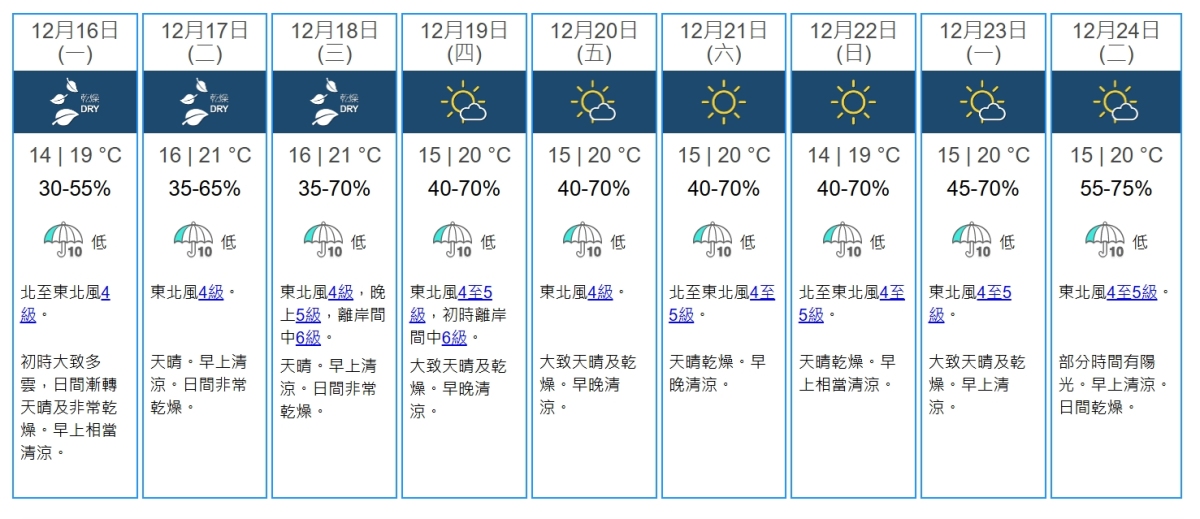 【點新聞報道】冬天到,天文台今早(15日)錄得最低氣溫13度,是入冬以來的最低紀錄,而新界再低兩三度。根據天文台最新發布九天天氣預報,下周六(12月21日)冬至及12月24日平安夜都不太暖,預料最低氣溫15度,最高氣溫20度。天文台亦預料明日(12月16日)朝早非常清涼,市區或低見14度,新界更凍。